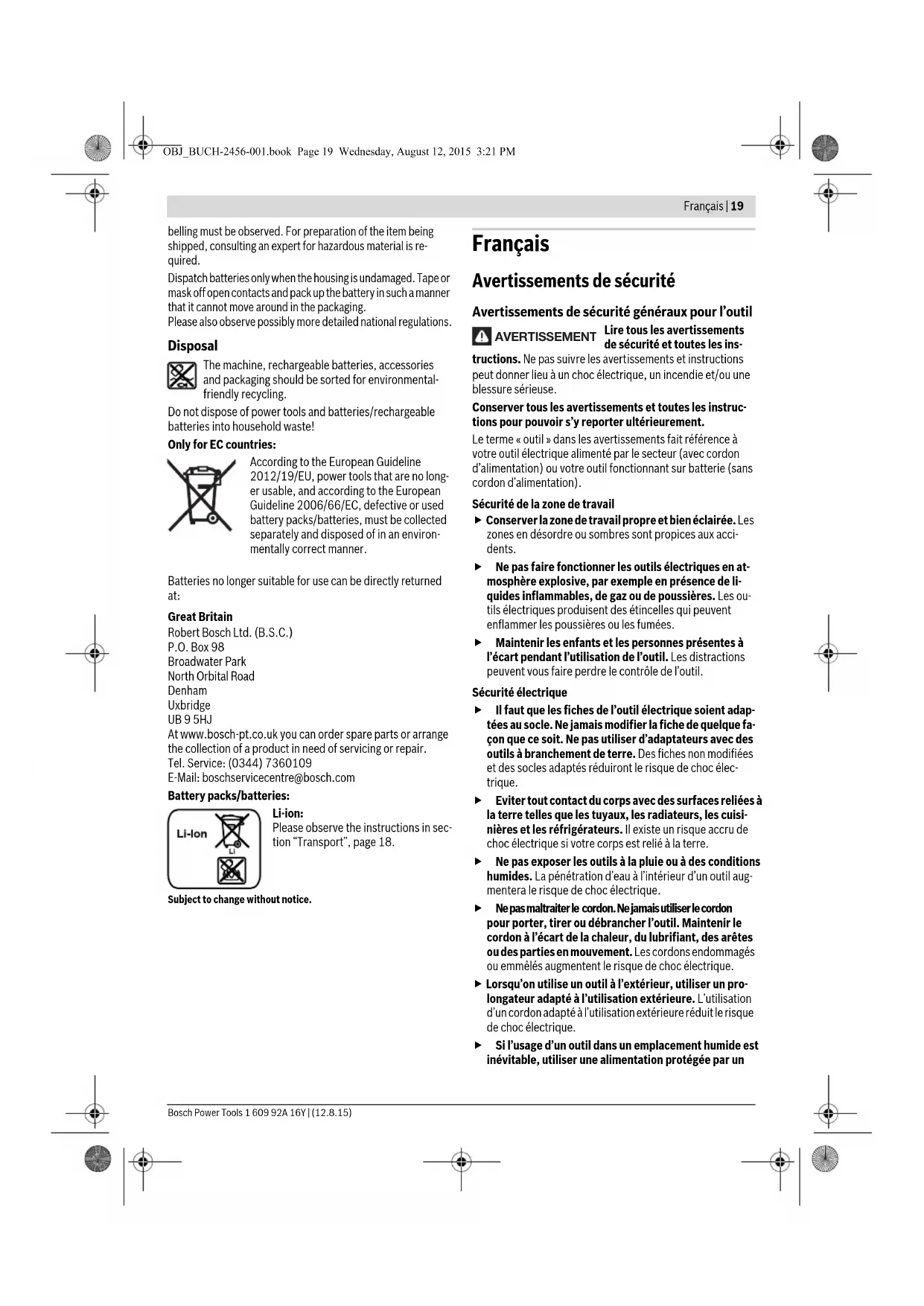 AVERTISSEMENT OBJ_BUCH-2456-001.book Page 19 Wednesday, August 12, 2015 3:21 PM20 | Français