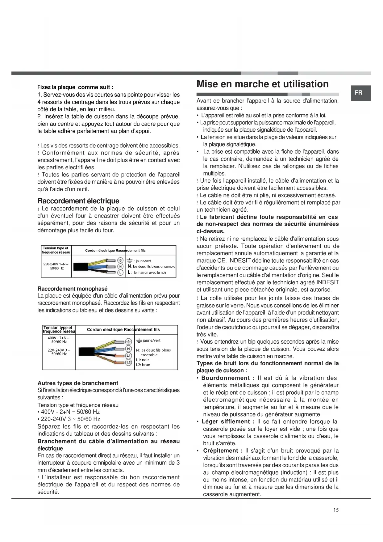 Toutes les parties servant de protection de l'appareil doivent être fi xées de manière à ne pouvoir être enlevées qu'à l'aide d'un outil. Tension type et fréquence réseauCordon électrique Raccordement fils220-240V 1+N ~ 50/60 Hz : jaune/vert : les deux fils bleus ensemble : le marron avec le noirTension type et fréquence réseauCordon électrique Raccordement fils400V - 2+N ~50/60 Hz220-240V 3 ~50/60 Hz : jaune/vertN: les deux ls bleus ensembleL1: noirL2: brun Mise en marche et utilisation