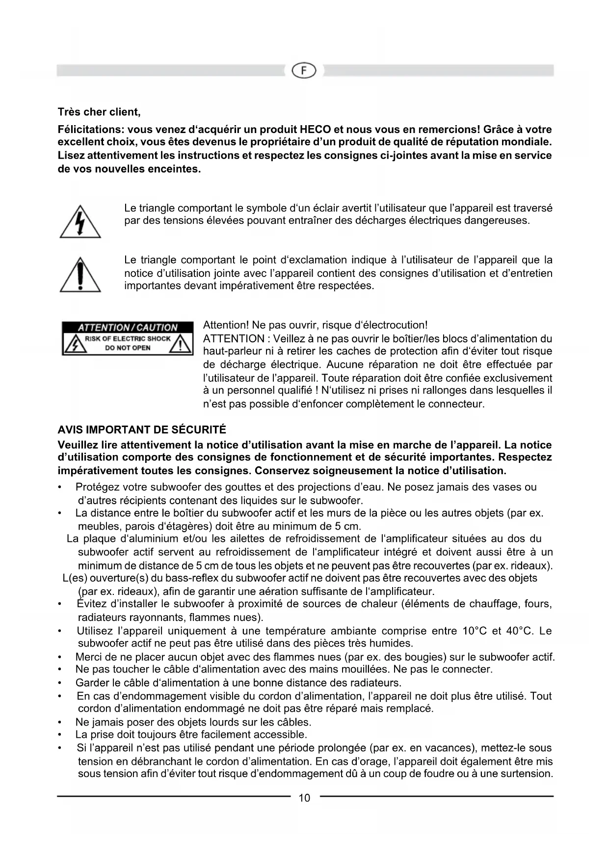 Cross-over frequency control (5) Used to set the upper limit of the subwoofer operating range. The cross-over frequency should be set to 50 to 150 Hz when the system is used in combination with shelf loudspeakers or 50 to 100 Hz when used with stand loudspeakers. Bass EQ control (6) The low bass range level at around 50 Hz may be varied by +/- 3dB with this control. Which makes adapting low bass sounds to the room as well as to personal taste easy. Phase switch (7) In normal use the phase switch should be set to 0°. However, in rare cases it may be advantageous to set the phase to 180° (e.g. if the subwoofer is far away from the front loudspeakers or in the event of unfavourable acoustics in the room). Generally speaking: the setting where the lower base tone area has a fuller sound is the correct one. Fuse (10) Only use a fuse with the parameters indicated inside the triangle next to the fuse holder, on the rear of the amplifier. MAINTENANCE The surface is best cleaned with a mild household cleaner. On no account use furniture polish or similar products. SPECIFICATIONS Configuration: bass reflex, sidefire Fitted with 30 cm long-stroke driver Output power RMS/Max.: 180 / 320 watts Frequency range: 20 – 150 Hz Cross-over frequency: 50 – 150 Hz, adjustable Dimensions (WxHxD): 290 x 500 x 464 mm Accessories: mains cable Subject to technical change.10 Très cher client, Félicitations: vous venez d‘acquérir un produit HECO et nous vous en remercions! Grâce à votre excellent choix, vous êtes devenus le propriétaire d’un produit de qualité de réputation mondiale. Lisez attentivement les instructions et respectez les consignes ci-jointes avant la mise en service de vos nouvelles enceintes. Le triangle comportant le symbole d‘un éclair avertit l’utilisateur que l’appareil est traversé par des tensions élevées pouvant entraîner des décharges électriques dangereuses. Le triangle comportant le point d‘exclamation indique à l’utilisateur de l’appareil que la notice d’utilisation jointe avec l’appareil contient des consignes d’utilisation et d’entretien importantes devant impérativement être respectées. Attention! Ne pas ouvrir, risque d‘électrocution! ATTENTION : Veillez à ne pas ouvrir le boîtier/les blocs d’alimentation du haut-parleur ni à retirer les caches de protection afin d‘éviter tout risque de décharge électrique. Aucune réparation ne doit être effectuée par l’utilisateur de l’appareil. Toute réparation doit être confiée exclusivement à un personnel qualifié ! N‘utilisez ni prises ni rallonges dans lesquelles il n’est pas possible d‘enfoncer complètement le connecteur.