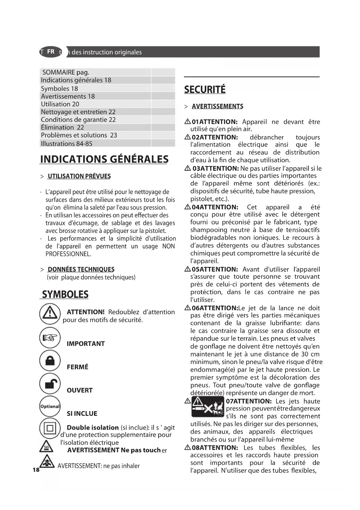 SOMMAIRE pag. Indications générales 18 Symboles 18 Avertissements 18 Utilisation 20 Nettoyage et entretien 22 Conditions de garantie 22 Élimination 22 Problèmes et solutions 23 Illustrations 84-85