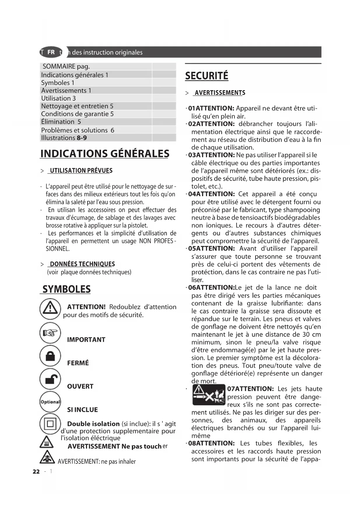 - 09ATTENTION: Appareils n’étant pas dotés de S.A.A. – Système d’Arrêt Automatique: ils ne doivent pas continuer de fonctionner plus de 2 minutes après que le pistolet a été relâché. L’eau recyclée augmente énormé- ment sa température détériorant gravement la pompe.