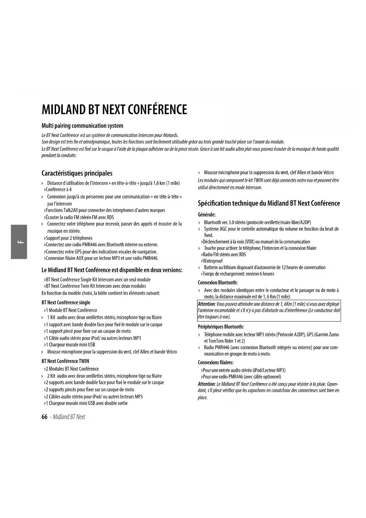 Multi pairing communication system Le BT Next Conférence est un système de communication Intercom pour Motards. Son design est très n et aérodynamique, toutes les fonctions sont facilement utilisable grâce au trois grande touché place sur l’avant du module. Le BT Next Conférence est xé sur le casque à l’aide de la plaque adhésive ou de la pince vissée. Grace à son kit audio ultra plat vous pouvez écouter de la musique de haute qualité pendant la conduite. Caractéristiques principales › Distance d’utilisation de l’Intercom « en tête-à-tête » jusqu’à 1,6 km (1 mile) › Conférence à 4 › Connexion jusqu’à six personnes pour une communication « en tête-à-tête » par l’intercom › Fonctions Talk2All pour connecter des interphones d’autres marques › Écouter la radio FM stéréo FM avec RDS › Connectez votre téléphone pour recevoir, passer des appels et écouter de la musique en stéréo. › Support pour 2 téléphones › Connectez une radio PMR446 avec Bluetooth interne ou externe. › Connectez votre GPS pour des indications vocales de navigation. › Connexion laire AUX pour un lecteur MP3 et une radio PMR446. Le Midland BT Next Conférence est disponible en deux versions: › BT Next Conférence Single Kit Intercom avec un seul module › BT Next Conférence Twin Kit Intercom avec deux modules En fonction du modèle choisi, la bôite contient les éléments suivant:BT Next Conférence single › 1 Module BT Next Conférence › 1 Kit audio avec deux oreillettes stéréo, microphone tige ou laire › 1 support avec bande double face pour xé le module sur le casque › 1 support pincé pour xer sur un casque de moto › 1 Câble audio stéréo pour iPod/ ou autres lecteurs MP3 › 1 Chargeur murale mini USB › Mousse microphone pour la suppression du vent, clef Allen et bande Velcro BT Next Conférence TWIN › 2 Modules BT Next Conférence › 2 Kit audio avec deux oreillettes stéréo, microphone tige ou laire › 2 supports avec bande double face pour xé le module sur le casque › 2 supports pincés pour xer sur un casque de moto › 2 Câbles audio stéréo pour iPod/ ou autres lecteurs MP3 › 1 Chargeur murale mini USB avec double sortie › Mousse microphone pour la suppression du vent, clef Allen et bande Velcro Les modules qui composent le kit TWIN sont déjà connectés entre eux et peuvent être utilisé directement en mode Intercom. Spécification technique du Midland BT Next Conférence Générale: › Bluetooth ver. 3.0 stéréo (protocole oreillette/main-libre/A2DP) › Système AGC pour le contrôle automatique du volume en fonction du bruit de fond. › Déclenchement à la voix (VOX) ou manuel de la communication › Touche pour activer: le téléphone, l’Intercom et la connexion laire › Radio FM stéréo avec RDS › Waterproof › Batterie au lithium disposant d’autonomie de 12 heures de conversation › Temps de rechargement: environ 6 heuresConnexion Bluetooth: › Avec des modules identiques entre le conducteur et le passager ou de moto à moto, la distance maximale est de 1, 6 Km (1 mile). Attention: Vous pouvez atteindre une distance de 1, 6Km (1 mile) si vous avez déployé l’antenne escamotable et s’il n’y a pas d’obstacle ou d’interférence (Le conducteur doit être toujours à vue).Périphériques Bluetooth: › Téléphone mobile avec lecteur MP3 stéréo (Protocole A2DP), GPS (Garmin Zumo et TomTom Rider 1 et 2) › Radio PMR446 (avec connexion Bluetooth intégrée ou externe) pour une com- munication en groupe de moto à moto. Connexions filaires: › Pour une entrée audio stéréo (iPod/Lecteur MP3) › Pour une radio PMR446 (avec câble optionnel) Attention: Le Midland BT Next Conférence a été conçu pour résister à la pluie. Cepen- dant, s’il pleut vériez que les capuchons en caoutchouc des connecteurs sont bien en place.F Midland BT Next - 67 Rechargement des batteries Attention: Assurez-vous le module soit totalement chargé avant son utilisation. Avant sa première utilisation pour un rechargement totale il faut laissez le module au moins 8 heures en charge. Charger le module en connectant le chargeur mural dans la prise de recharge- ment (soulevez le capuchon pour insérer la prise). La LED rouge sur le module clignote pendant le chargement. Laissez en charge jusqu’à ce que le module cesse de clignoter ou que la LED passé au bleu. Quand la charge est complète (La LED rouge ne clignote plus), retirez le module du chargeur. Normalement, après la première utilisation, il faut 6 heures pour un recharge- ment complet. Attention: à chaque fois que le chargeur mini USB est connecté (ou déconnecté), le module est automatiquement éteint. Pour pouvoir l’utiliser pendant le chargement, il faut allumer le module avec le chargeur déjà connecté. Description du module et fixation Description du BT Next Conférence Le BT Next Conférence possède 5 touches sur l’avant. Les trois principaux sont : Avancé (sur la gauche), la touché centrale et Reculer (sur la droite). Les deux peti- tes touches sont: Volume + et Volume -. Centrale Volume -Volume + Avant Arrière Description des connexions filaires › Jack de charge: Permet de recharger le module à l’aide d’un chargeur standard mini USB. › Jack kit audio: Permet de connecter le kit audio (Oreillette stéréo et micro- phone) › Jack Auxiliaire Audio (AUX) 2.5mm : Peut être utilisé pour connecter une source audio tel qu’un iPod/lecteur MP3, ou une radio PMR446 Jack de chargeJack kit audioJack Auxiliaire Audio (AUX) En plus le BT Next Conférence a une antenne escamotable sur le dessus pour un maximum de distance. Pour soulever l’antenne, appuyez doucement à l’arrière et l’antenne se relève automatiquement. Pour la rabattre, bascule l’antenne en arrière et appuyez en position fermée. Description du kit audio Le système audio comprend deux oreillettes ultra-plates stéréo et deux micros inter