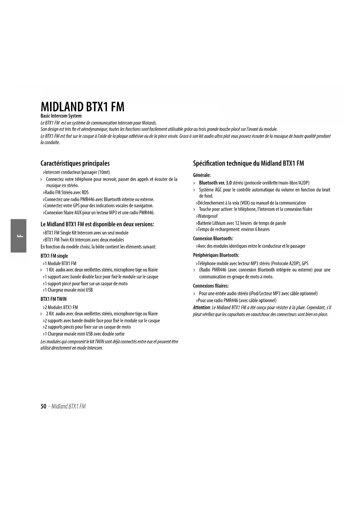 Basic Intercom SystemLe BTX1 FM est un système de communication Intercom pour Motards. Son design est très n et aérodynamique, toutes les fonctions sont facilement utilisable grâce au trois grande touche placé sur l’avant du module. Le BTX1 FM est xé sur le casque à l’aide de la plaque adhésive ou de la pince vissée. Grace à son kit audio ultra plat vous pouvez écouter de la musique de haute qualité pendant la conduite. Caractéristiques principales › Intercom conducteur/passager (10mt) › Connectez votre téléphone pour recevoir, passer des appels et écouter de la musique en stéréo. › Radio FM Stéréo avec RDS › Connectez une radio PMR446 avec Bluetooth interne ou externe. › Connectez votre GPS pour des indications vocales de navigation. › Connexion laire AUX pour un lecteur MP3 et une radio PMR446. Le Midland BTX1 FM est disponible en deux versions: › BTX1 FM Single Kit Intercom avec un seul module › BTX1 FM Twin Kit Intercom avec deux modules En fonction du modèle choisi, la bôite contient les éléments suivant:BTX1 FM single › 1 Module BTX1 FM › 1 Kit audio avec deux oreillettes stéréo, microphone tige ou laire › 1 support avec bande double face pour xé le module sur le casque › 1 support pincé pour xer sur un casque de moto › 1 Chargeur murale mini USB BTX1 FM TWIN › 2 Modules BTX1 FM › 2 Kit audio avec deux oreillettes stéréo, microphone tige ou laire › 2 supports avec bande double face pour xé le module sur le casque › 2 supports pincés pour xer sur un casque de moto › 1 Chargeur murale mini USB avec double sortie Les modules qui composent le kit TWIN sont déjà connectés entre eux et peuvent être utilisé directement en mode Intercom. Spécification technique du Midland BTX1 FM Générale: › Bluetooth ver. 3.0 stéréo (protocole oreillette/main-libre/A2DP) › Système AGC pour le contrôle automatique du volume en fonction du bruit de fond. › Déclenchement à la voix (VOX) ou manuel de la communication › Touche pour activer: le téléphone, l’Intercom et la connexion laire › Waterproof › Batterie Lithium avec 12 heures de temps de parole › Temps de rechargement: environ 6 heuresConnexion Bluetooth: › Avec des modules identiques entre le conducteur et le passagerPériphériques Bluetooth: › Téléphone mobile avec lecteur MP3 stéréo (Protocole A2DP), GPS › (Radio PMR446 (avec connexion Bluetooth intégrée ou externe) pour une communication en groupe de moto à moto. Connexions filaires: › Pour une entrée audio stéréo (iPod/Lecteur MP3 avec câble optionnel) › Pour une radio PMR446 (avec câble optionnel)Attention: Le Midland BTX1 FM a été conçu pour résister à la pluie. Cependant, s’il pleut vériez que les capuchons en caoutchouc des connecteurs sont bien en place.F Midland BTX1 FM - 51 Rechargement des batteries Attention: Assurez-vous le module soit totalement chargé avant son utilisation. Avant sa première utilisation pour un rechargement totale il faut laissez le module au moins 8 heures en charge. Charger le module en connectant le chargeur mural dans la prise de recharge- ment (soulevez le capuchon pour insérer la prise). La LED rouge sur le module clignote pendant le chargement. Laissez en charge jusqu’à ce que le module cesse de clignoter ou que la LED passé au bleu. Quand la charge est complète (La LED rouge ne clignote plus), retirez le module du chargeur. Normalement, après la première utilisation, il faut 6 heures pour un recharge- ment complet. Attention: à chaque fois que le chargeur mini USB est connecté (ou déconnecté), le module est automatiquement éteint. Pour pouvoir l’utiliser pendant le chargement, il faut allumer le module avec le chargeur déjà connecté. Description du module et fixation Description du BTX1 FM Le BTX1 FM possède 5 touches sur l’avant. Les trois principaux sont : Avancé (sur la gauche), la touché centrale et Reculer (sur la droite). Les deux petites touches sont: Volume + et Volume -. CentraleVolume -Volume +Avanti Indietro Description des connexions filaires › Jack de charge: Permet de recharger le module à l’aide d’un chargeur standard mini USB. › Jack kit audio: Permet de connecter le kit audio (Oreillette stéréo et micro- phone) › Jack Auxiliaire Audio (AUX) 2.5mm : Peut être utilisé pour connecter une source audio tel qu’un iPod/lecteur MP3, ou une radio PMR446 Presa ricarica Presa audio kit Presa audio ausiliaria (AUX) Description du kit audio Le système audio comprend deux oreillettes ultra-plates stéréo et deux micros interchan- geables, qui sont tous deux fourni avec un support et un câble de connexion. Fixation des oreillettes stéréo Les deux oreillettes stéréo on des adhésifs/ Velcro pour faciliter leur xation dans votre casque. Attention de ne pas totalement recouvrir vos oreilles avec les oreillettes, vous de- vez toujours être en mesure d’entendre le trac et les indications routières. Le microphone peut être xé dans le casque de deux manières diérentes: Microphone tige Placez la pièce adhésive/Velcro entre le support et le casque, an que le micro- phone soit place devant votre bouche avec le symbole blanc vers vous. Se type de micro est adapté pour les casques jet ou modulable. Microphone filaire Utilisez la pièce adhésive/Velcro et placez le microphone dans votre casque en face de votre bouche. Ce type de microphone est conseillé pour les casques intégraux. Le connecteur miniature vous permet de choisir le microphone en fon- ction du casque que vous utilisez. Jack du kit audio Le kit audio doit être raccordé au connecteur central du Midland BTX1 FM à l’aide de la prise coudée (en forme de L).52 - Midland BTX1 FM