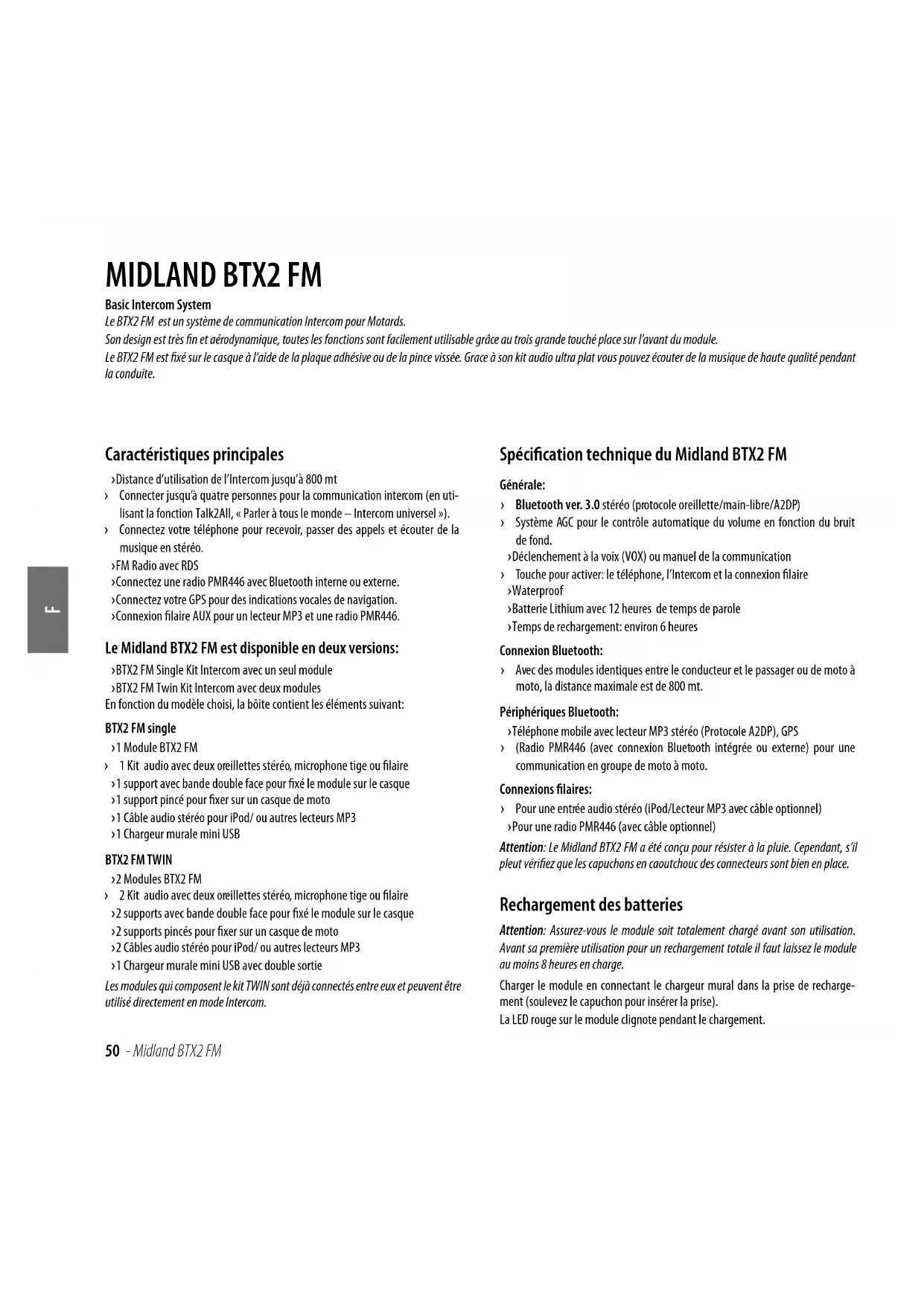 Basic Intercom SystemLe BTX2 FM est un système de communication Intercom pour Motards. Son design est très fin et aérodynamique, toutes les fonctions sont facilement utilisable grâce au trois grande touché place sur l’avant du module. Le BTX2 FM est fixé sur le casque à l’aide de la plaque adhésive ou de la pince vissée. Grace à son kit audio ultra plat vous pouvez écouter de la musique de haute qualité pendant la conduite. Caractéristiques principales › Distance d’utilisation de l’Intercom jusqu’à 800 mt › Connecter jusqu’à quatre personnes pour la communication intercom (en uti- lisant la fonction Talk2All, « Parler à tous le monde – Intercom universel »). › Connectez votre téléphone pour recevoir, passer des appels et écouter de la musique en stéréo. › FM Radio avec RDS › Connectez une radio PMR446 avec Bluetooth interne ou externe. › Connectez votre GPS pour des indications vocales de navigation. › Connexion filaire AUX pour un lecteur MP3 et une radio PMR446. Le Midland BTX2 FM est disponible en deux versions: › BTX2 FM Single Kit Intercom avec un seul module › BTX2 FM Twin Kit Intercom avec deux modules En fonction du modèle choisi, la bôite contient les éléments suivant:BTX2 FM single › 1 Module BTX2 FM › 1 Kit audio avec deux oreillettes stéréo, microphone tige ou filaire › 1 support avec bande double face pour fixé le module sur le casque › 1 support pincé pour fixer sur un casque de moto › 1 Câble audio stéréo pour iPod/ ou autres lecteurs MP3 › 1 Chargeur murale mini USB BTX2 FM TWIN › 2 Modules BTX2 FM › 2 Kit audio avec deux oreillettes stéréo, microphone tige ou filaire › 2 supports avec bande double face pour fixé le module sur le casque › 2 supports pincés pour fixer sur un casque de moto › 2 Câbles audio stéréo pour iPod/ ou autres lecteurs MP3 › 1 Chargeur murale mini USB avec double sortie Les modules qui composent le kit TWIN sont déjà connectés entre eux et peuvent être utilisé directement en mode Intercom. Spécification technique du Midland BTX2 FM Générale: › Bluetooth ver. 3.0 stéréo (protocole oreillette/main-libre/A2DP) › Système AGC pour le contrôle automatique du volume en fonction du bruit de fond. › Déclenchement à la voix (VOX) ou manuel de la communication › Touche pour activer: le téléphone, l’Intercom et la connexion filaire › Waterproof › Batterie Lithium avec 12 heures de temps de parole › Temps de rechargement: environ 6 heuresConnexion Bluetooth: › Avec des modules identiques entre le conducteur et le passager ou de moto à moto, la distance maximale est de 800 mt. Périphériques Bluetooth: › Téléphone mobile avec lecteur MP3 stéréo (Protocole A2DP), GPS › (Radio PMR446 (avec connexion Bluetooth intégrée ou externe) pour une communication en groupe de moto à moto. Connexions filaires: › Pour une entrée audio stéréo (iPod/Lecteur MP3 avec câble optionnel) › Pour une radio PMR446 (avec câble optionnel)Attention: Le Midland BTX2 FM a été conçu pour résister à la pluie. Cependant, s’il pleut vérifiez que les capuchons en caoutchouc des connecteurs sont bien en place. Rechargement des batteries Attention: Assurez-vous le module soit totalement chargé avant son utilisation. Avant sa première utilisation pour un rechargement totale il faut laissez le module au moins 8 heures en charge. Charger le module en connectant le chargeur mural dans la prise de recharge-ment (soulevez le capuchon pour insérer la prise).La LED rouge sur le module clignote pendant le chargement.F Midland BTX2 FM- 51 Laissez en charge jusqu’à ce que le module cesse de clignoter ou que la LED passé au bleu. Quand la charge est complète (La LED rouge ne clignote plus), retirez le module du chargeur. Normalement, après la première utilisation, il faut 6 heures pour un recharge- ment complet. Attention: à chaque fois que le chargeur mini USB est connecté (ou déconnecté), le module est automatiquement éteint. Pour pouvoir l’utiliser pendant le chargement, il faut allumer le module avec le chargeur déjà connecté. Description du module et fixation Description du BTX2 FM Le BTX2 FM possède 5 touches sur l’avant. Les trois principaux sont : Avancé (sur la gauche), la touché centrale et Reculer (sur la droite). Les deux petites touches sont: Volume + et Volume -. Middle buttonVolume -Volume +Forward button Backward button Description des connexions filaires › Jack de charge: Permet de recharger le module à l’aide d’un chargeur standard mini USB. › Jack kit audio: Permet de connecter le kit audio (Oreillette stéréo et micro- phone) › Jack Auxiliaire Audio (AUX) 2.5mm : Peut être utilisé pour connecter une source audio tel qu’un iPod/lecteur MP3, ou une radio PMR446 Charger jackAudio kit jackAuxiliary audio jack (AUX) En plus le BTX2 FM a une antenne escamotable sur le dessus pour un maximum de distance. Pour soulever l’antenne, appuyez doucement à l’arrière et l’antenne se relève automatiquement. Pour la rabattre, bascule l’antenne en arrière et appuyez en position fermée. Description du kit audio Le système audio comprend deux oreillettes ultra-plates stéréo et deux micros interchan- geables, qui sont tous deux fourni avec un support et un câble de connexion. Fixation des oreillettes stéréo Les deux oreillettes stéréo on des adhésifs/ Velcro pour faciliter leur fixation dans votre casque. Attention de ne pas totalement recouvrir vos oreilles avec les oreillettes, vous de- vez toujours être en mesure d’entendre le trafic et les indications routières. Le microphone peut être fixé dans le casque de deux manières différentes: Microphone tige Placez la pièce adhésive/Velcro entre le support et le casque, afin que le micro- phone soit place devant votre bouche avec le symbole blanc vers vous. Se type de micro est adapté pour les casques jet ou modulable.52 - Midland BTX2 