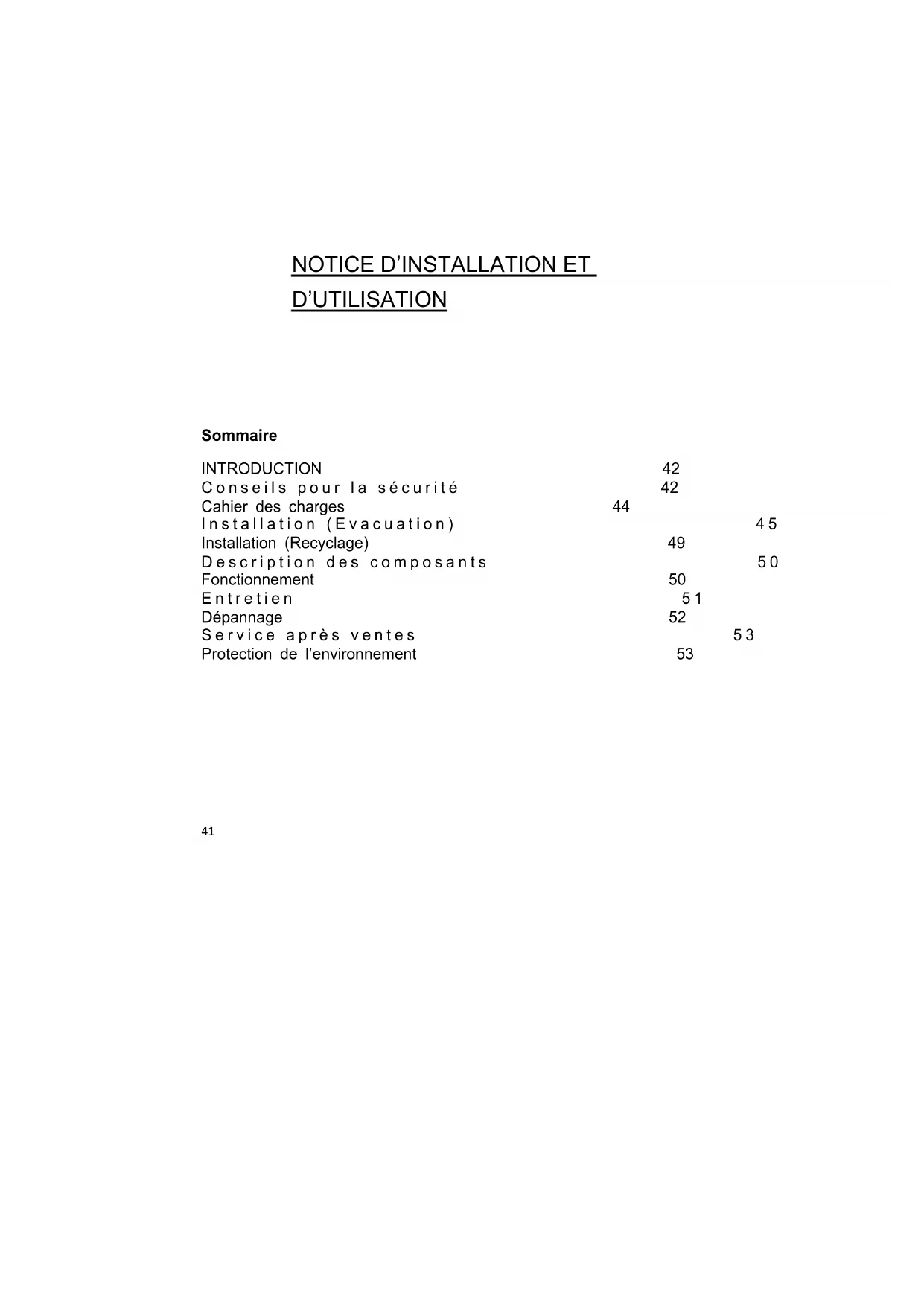 Cahier des charges 44 Installation (Evacuation) 45 Installation (Recyclage) 49 Description des composants 50 Fonctionnement 50 Entretien 51 Dépannage 52 Service après ventes 53 Protection de l’environnement 5342