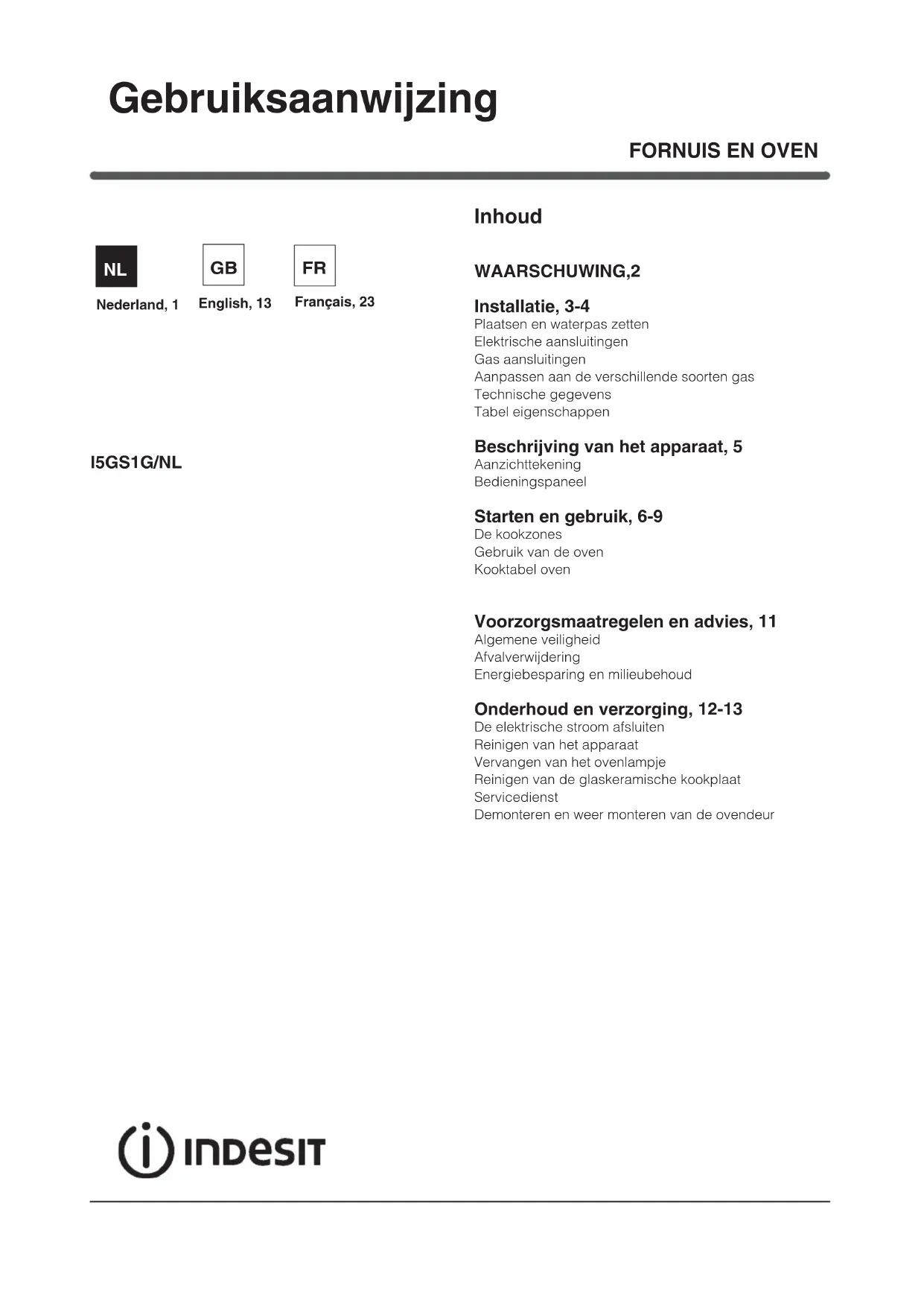 I5GS1G(W)NL - Cuisinière INDESIT - Notice d'utilisation et mode d'emploi gratuit