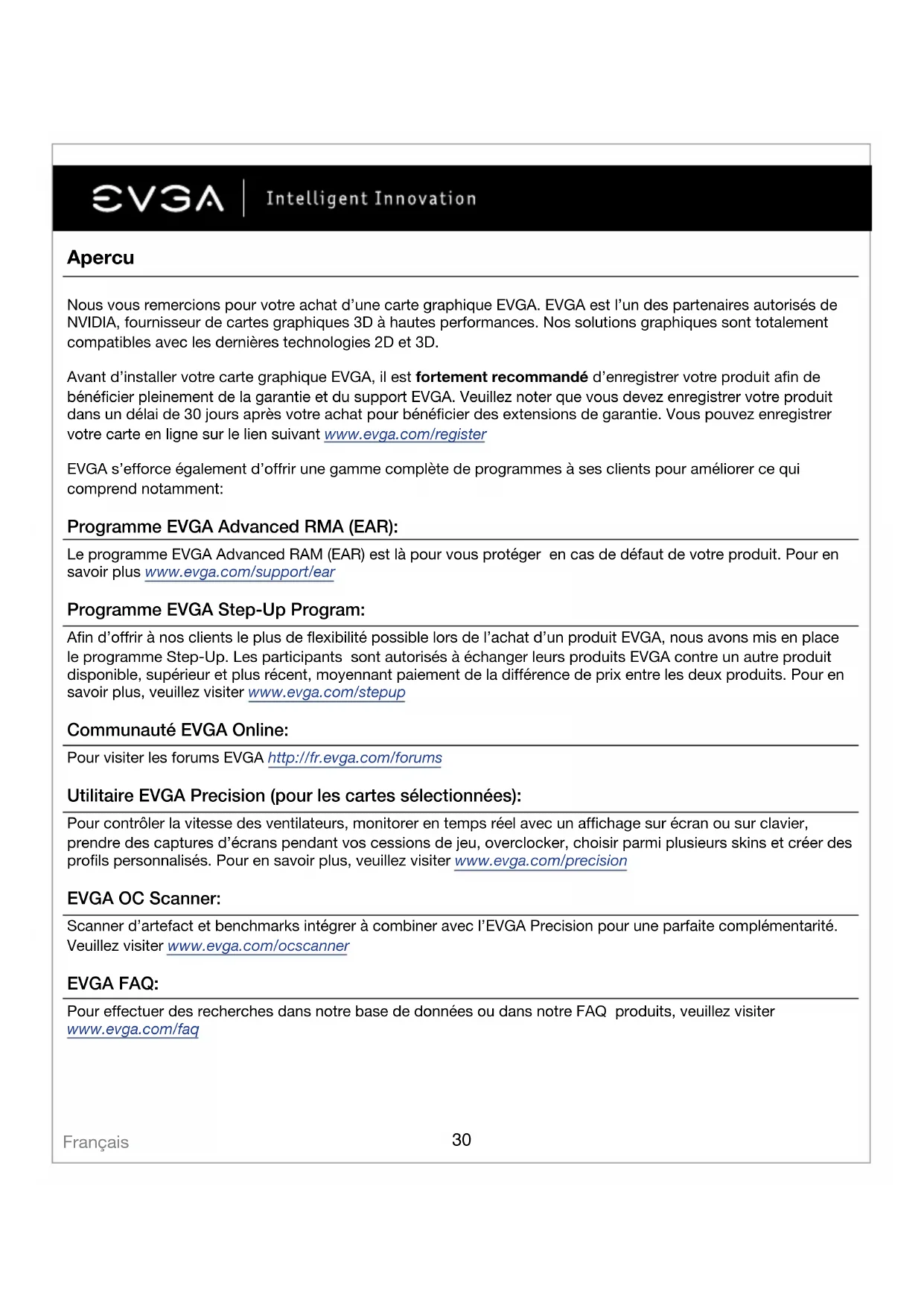 - Informations sur la conformité Français30 Apercu Nous vous remercions pour votre achat d’une carte graphique EVGA. EVGA est l’un des partenaires autorisés de NVIDIA, fournisseur de cartes graphiques 3D à hautes performances. Nos solutions graphiques sont totalement compatibles avec les dernières technologies 2D et 3D. Avant d’installer votre carte graphique EVGA, il est fortement recommandé d’enregistrer votre produit afin de bénéficier pleinement de la garantie et du support EVGA. Veuillez noter que vous devez enregistrer votre produit dans un délai de 30 jours après votre achat pour bénéficier des extensions de garantie. Vous pouvez enregistrer votre carte en ligne sur le lien suivant www.evga.com/register EVGA s’efforce également d’offrir une gamme complète de programmes à ses clients pour améliorer ce qui comprend notamment: Programme EVGA Advanced RMA (EAR): Le programme EVGA Advanced RAM (EAR) est là pour vous protéger en cas de défaut de votre produit. Pour en savoir plus www.evga.com/support/ear Programme EVGA Step-Up Program: Afin d’offrir à nos clients le plus de flexibilité possible lors de l’achat d’un produit EVGA, nous avons mis en place le programme Step-Up. Les participants sont autorisés à échanger leurs produits EVGA contre un autre produit disponible, supérieur et plus récent, moyennant paiement de la différence de prix entre les deux produits. Pour en savoir plus, veuillez visiter www.evga.com/stepup Communauté EVGA Online: Pour visiter les forums EVGA http://fr.evga.com/forums Utilitaire EVGA Precision (pour les cartes sélectionnées): Pour contrôler la vitesse des ventilateurs, monitorer en temps réel avec un affichage sur écran ou sur clavier, prendre des captures d’écrans pendant vos cessions de jeu, overclocker, choisir parmi plusieurs skins et créer des profils personnalisés. Pour en savoir plus, veuillez visiter www.evga.com/precision EVGA OC Scanner: Scanner d’artefact et benchmarks intégrer à combiner avec l’EVGA Precision pour une parfaite complémentarité. Veuillez visiter www.evga.com/ocscanner EVGA FAQ: Pour effectuer des recherches dans notre base de données ou dans notre FAQ produits, veuillez visiter www.evga.com/faq Français31 EVGA Gaming: Si vous vivez pour jouer, cet endroit est pour vous! Nous avons les meilleurs serveurs dédiés, tournois, et prix. Veuillez visiter www.evga.com/gaming Folding@EVGA: Le calcul partagé pour le plus grand bien de tous. Savez vous que vous pouvez dédier votre carte graphique au calcul partagé? Veuillez visiter www.evga.com/folding EVGA Social Networks: Suivez l‘actualité d’EVGA, les promotions en cours, les concours, les conseils techniques, les nouveaux produits et les nouveaux drivers sur votre réseau social favori! Veuillez visitez www.evga.com/sonet MODS RIGS: $1K de sponsoring tout les 200 posts. Venez montrer votre plateforme et rejoignez l’un des plus fameux programmes d’EVGA. www.modsrigs.com EVGAontheTUBE: Conseils d’installation, troubleshooting guides de résolution des problèmes et présentation vidéo des nouveaux produits! www.youtube.com/evgaonthetube Installation du materiel composants. Si vous ne vous sentez pas à l’aise avec le fait de monter vous-même vos composants, veuillez consulter un technicien informatique qualifié. Les dommages causés à votre système, à la carte graphique, ou à vous-même, peuvent être occasionnés si l’appareil est sous tension pendant l’installation. Maintenant que vous avez préparé votre ordinateur, vous êtes prêt à installer votre carte graphique. Démarrage rapide p. 37