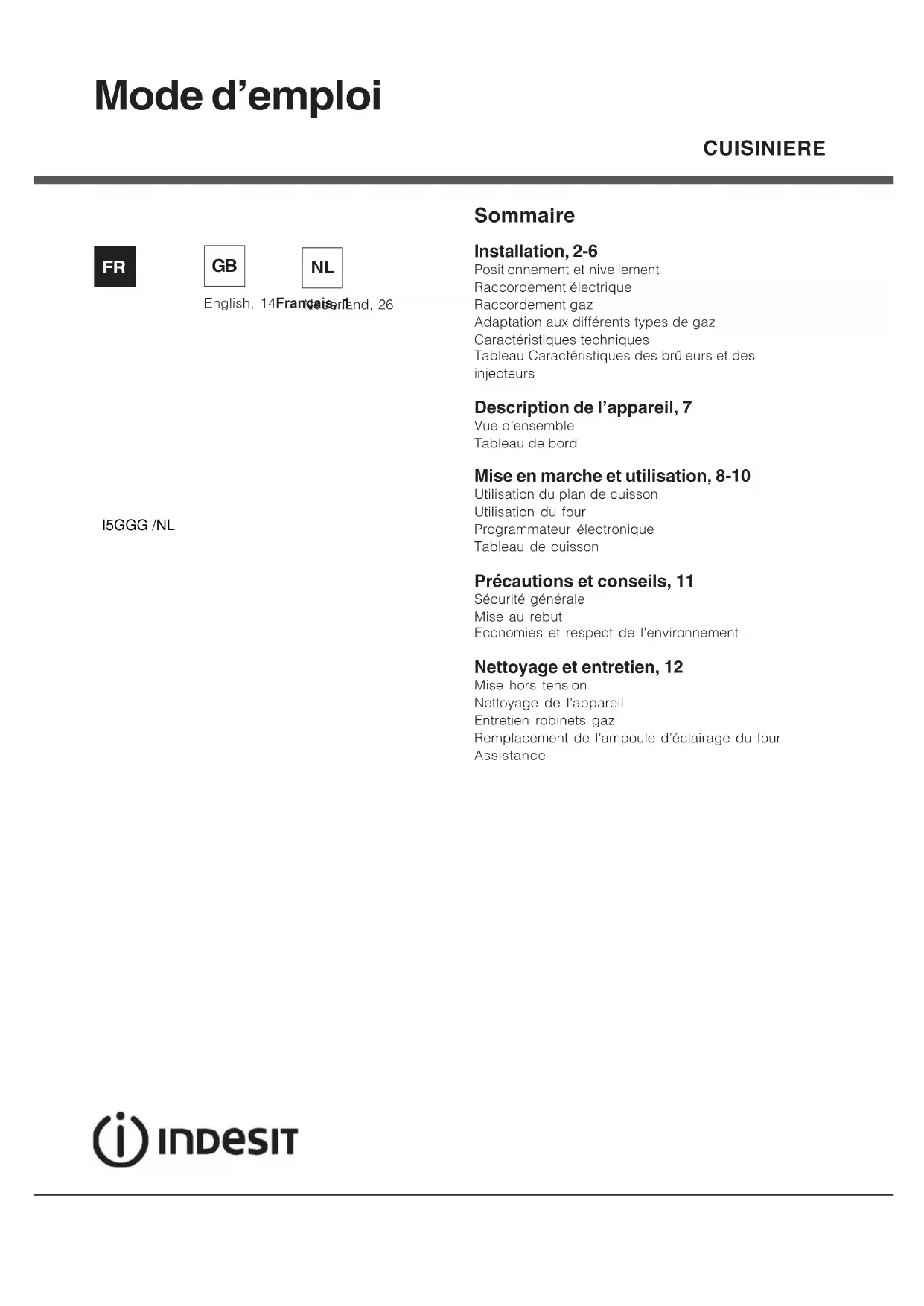 I5GGG(W)NL - Cuisinière INDESIT - Notice d'utilisation et mode d'emploi gratuit