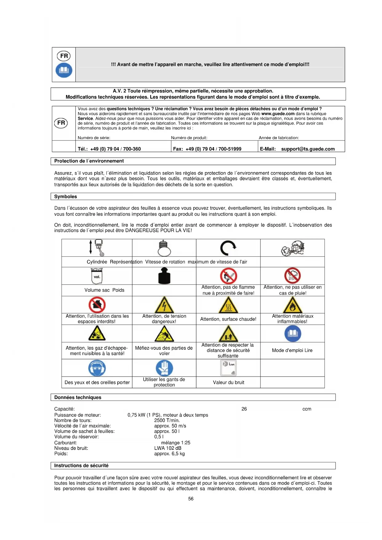 Tél.: +49 (0) 79 04 / 700-360 Fax: +49 (0) 79 04 / 700-51999 E-Mail: support@ts.guede.com Protection de l´environnement Assurez, s´il vous plaît, l´élimination et liquidation selon les règles de protection de l´environnement correspondantes de tous les matériaux dont vous n´avez plus besoin. Tous les outils, matériaux et emballages devraient être classés et, éventuellement, transportés aux lieux autorisés de la liquidation des déchets de la sorte en question. Symboles Dans l´écusson de votre aspirateur des feuilles à essence vous pouvez trouver, éventuellement, les instructions symboliques. Ils vous font connaître les informations importantes quant au produit ou les instructions quant à son emploi. On doit, inconditionnellement, lire le mode d´emploi entier avant de commencer à employer le dispositif. L´inobservation des instructions de l´emploi peut être DANGEREUSE POUR LA VIE!