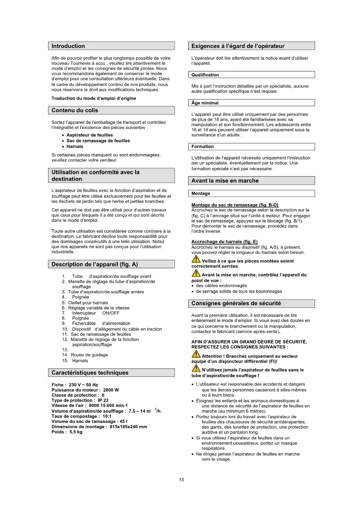 Couplings on the engine are not tightened properly Check the plugging and protection To be checked or replaced in the customer service centre. Collection bag mount so that the limit switch is actuated. To be checked or replaced in the customer service centre. Appliance not sucking Collection bag is full Suction tube is blocked Switch to “Blowing“ Empty the collection bag Clean the suction tube Switch to “Suction““ Appliance not blowing Switch to “Suction“ Switch to “Blowing“ 12Introduction Afin de pouvoir profiter le plus longtemps possible de votre nouveau Tournevis á accu , veuillez lire attentivement le mode d’emploi et les consignes de sécurité jointes. Nous vous recommandons également de conserver le mode d’emploi pour une consultation ultérieure éventuelle. Dans le cadre du développement continu de nos produits, nous nous réservons le droit aux modifications techniques. Traduction du mode d’emploi d’origine Contenu du colis Sortez l’appareil de l’emballage de transport et contrôlez l’intégralité et l’existence des pièces suivantes : Aspirateur de feuilles Sac de ramassage de feuilles Harnais Si certaines pièces manquent ou sont endommagées, veuillez contacter votre vendeur. Utilisation en conformité avec la destination L’aspirateur de feuilles avec la fonction d’aspiration et de soufflage peut être utilisé exclusivement pour les feuilles et les déchets de jardin tels que herbe et petites branches. Cet appareil ne doit pas être utilisé pour d’autres travaux que ceux pour lesquels il a été conçu et qui sont décrits dans le mode d’emploi. Toute autre utilisation est considérée comme contraire à la destination. Le fabricant décline toute responsabilité pour des dommages consécutifs à une telle utilisation. Notez que nos appareils ne sont pas conçus pour l’utilisation industrielle. Description de l’appareil (fig. A)