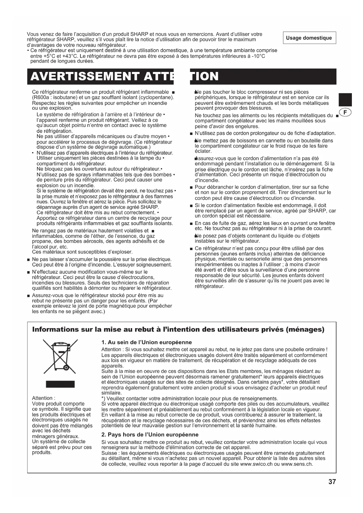Ruote orientabiliTenere quanto più possibile spazio di ventilazione intorno al ■frigorifero.Non installate il frigorifero in zone esposte alla luce del sole ■e nelle dirette vicinanze di sorgenti di calore.Tenere aperta la porta del frigorifero il minor tempo ■possibile.Raffreddare I cibi caldi prima di conservarli in frigo. ■Disporre gli alimenti sui ripiani omogeneamente per ■consentire che l’aria di raffreddamento possa circolare in modo efciente. 300mm 90mm 300mm 60mm Vasca di evaporazione Consigli per il risparmio energetico (B325-3)P26-P36_Ita.indd 35 2012/10/29 11:21:4536 Prima di chiamare il servizio di assistenza controllate i seguenti punti. Problema Soluzione La parte esterna del frigorifero risulta calda quando viene toccata. Questo è normale. Nei frigoriferi è situato un tubo caldo per prevenire la formazione di condensa. Il frigorifero emette rumore. É normale che il frigorifero produca i seguenti rumori. Forte rumore prodotto dal compressore quando sta avviandosi a funzionare. Il rumore si • attenua dopo un momento. Forte rumore prodotto una volta al giorno dal compressore. Rumore prodotto • immediatamente dopo l’operazione automatica di scongelamento. Rumore della circolazione del uido (rumore di gorgoqlio e rumore di liquido che “frizza”) • --- Rumore del refrigerante che ricircola nelle tubazioni. Rumore di scricchiolio, squittio • --- Rumore prodotto dall’espansione e contrazione delle pareti interne e delle parti interne durante il congelamento. Si forma della condensa o del ghiaccio sulle parti interne o esterne del frigorifero. Ciò può vericarsi in uno dei seguenti casi. Utilizzare un panno umido per rimuovere il ghiaccio e un panno asciutto per rimuovere la condensa. Quando l’umidità dell’ambiente è elevata.• Quando la porta viene aperta e chiusa spesso.• Quando vengono conservati prodotti alimentari molto umidi. (È necessario un involucro).• I prodotti alimentari nel comparto frigorifero si congelano. Il frigorifero funziona per lungo tempo con controllo temp. frigorifero impostato su 0 °C?• Il frigorifero funziona per lungo tempo con controllo temp. freezer impostato su -21 °C?• Una bassa temperatura della stanza può causare il congelamento dei cibi conservati anche • se il controllo temp. frigorifero é impostato a 6 °C. Nel comparto c’è un odore sgradevole. È necessario un involucro per i prodotti alimentari con un odore forte.• L’unità di deodorizzazione non è in grado di rimuovere tutti i cattivi odori.• SE É ANCORA NECESSARIO IL SERVIZIO DI ASSISTENZA Rivolgetevi al più vicino centro di assistenza approvato da SHARP. PRIMA DI CHIAMARE IL SERVIZIO DI ASSISTENZA (B325-3)P26-P36_Ita.indd 36 2012/10/29 11:21:4537 Usage domestique Vous venez de faire l’acquisition d’un produit SHARP et nous vous en remercions. Avant d’utiliser votre réfrigérateur SHARP, veuillez s’il vous plaît lire la notice d’utilisation an de pouvoir tirer le maximum d’avantages de votre nouveau réfrigérateur. Ce réfrigérateur est uniquement destiné à une utilisation domestique, à une température ambiante comprise • entre +5°C et +43°C. Le réfrigérateur ne devra pas être exposé à des températures inférieures à -10°C pendant de longues durées. AVERTISSEMENT ATTENTION Ce réfrigérateur renferme un produit réfrigérant inammable ■ (R600a : isobutane) et un gaz soufant isolant (cyclopentane). Respectez les règles suivantes pour empêcher un incendie ou une explosion. Le système de réfrigération à l’arrière et à l’intérieur de • l’appareil renferme un produit réfrigérant. Veillez à ce qu’aucun objet pointu n’entre en contact avec le système de réfrigération. Ne pas utiliser d’appareils mécaniques ou d’autre moyen • pour accélérer le processus de dégivrage. (Ce réfrigérateur dispose d’un systéme de dégivrage automatique.) N’utilisez pas d’appareils électriques à l’intérieur du réfrigérateur.• Utiliser uniquement les pièces destinées à la lampe du • compartiment du réfrigérateur. Ne bloquez pas les ouvertures autour du réfrigérateur.• N’utilisez pas de sprays inammables tels que des bombes • de peinture près du réfrigérateur. Ceci peut causer une explosion ou un incendie. Si le système de réfrigération devait être percé, ne touchez pas • la prise murale et n’exposez pas le réfrigérateur à des ammes nues. Ouvrez la fenêtre et aérez la pièce. Puis sollicitez le dépannage auprès d’un agent de service agréé SHARP. Ce réfrigérateur doit être mis au rebut correctement. • Apportez ce réfrigérateur dans un centre de recyclage pour produits réfrigérants inammables et gaz soufants isolants. Ne rangez pas de matériaux hautement volatiles et ■ inammables, comme de l’éther, de l’essence, du gaz propane, des bombes aérosols, des agents adhésifs et de l’alcool pur, etc. Ces matériaux sont susceptibles d’exploser. Ne pas laisser s’accumuler la poussière sur la prise électrique. ■ Ceci peut être à l’origine d’incendie. L’essuyer soigneusement. N’effectuez aucune modication vous-même sur le ■ réfrigérateur. Ceci peut être la cause d’électrocutions, incendies ou blessures. Seuls des techniciens de réparation qualiés sont habilités à démonter ou réparer le réfrigérateur. Assurez-vous que le réfrigérateur stocké pour être mis au ■ rebut ne présente pas un danger pour les enfants. (Par exemple enlevez le joint de porte magnétique pour empêcher les enfants ne se piègent avec.) Ne pas toucher le bloc compresseur ni ses pièces ■ périphériques, lorsque le réfrigérateur est en service car ils peuvent être extrêmement chauds et les bords métalliques peuvent provoquer des blessures. Ne touchez pas les aliments ou les récipients métalliques du ■ compartiment congélateur avec les mains mouillées sous peine d’avoir des engelures. N’utilisez pas
