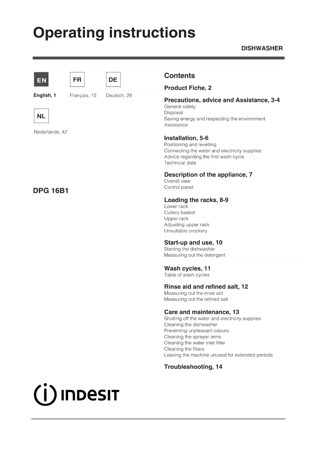 DPG 16B1 CA NX EU - Lave-vaisselle INDESIT - Notice d'utilisation et mode d'emploi gratuit