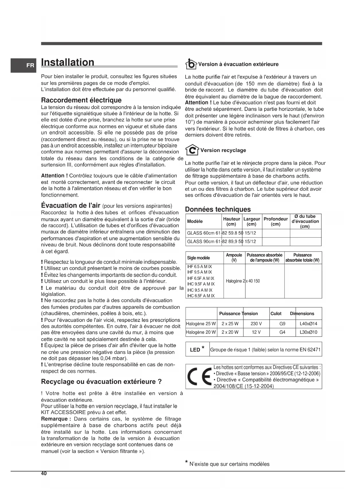 Données techniques ModèleHauteur (cm) Largeur (cm) Profondeur (cm) Ø du tube d'évacuation (cm) GLASS 60cm 61-82 59.8 50 15/12GLASS 90cm 61-82 89,9 50 15/12Sigle modèleAmpoule (V) Puissance absorbée de l'ampoule (W)Puissance absorbée totale (W)IHF 6.5 A M IXIHF 9.5 A M IXIHF 6.5F A M IXIHC 9.5F A M IXIHC 9.5 A M IXIHC 6.5F A M IXHalogène 2 x 40 150Puissance Tension Culot DimensionsHalogène 25 W 2 x 25 W 230 V G9 L40xØ14 Halogène 20 W 2 x 20 W 12 V G4 L30xØ10 LED *Groupe de risque 1 (faible) selon la norme EN 62471 Les hottes sont conformes aux Directives CE suivantes :