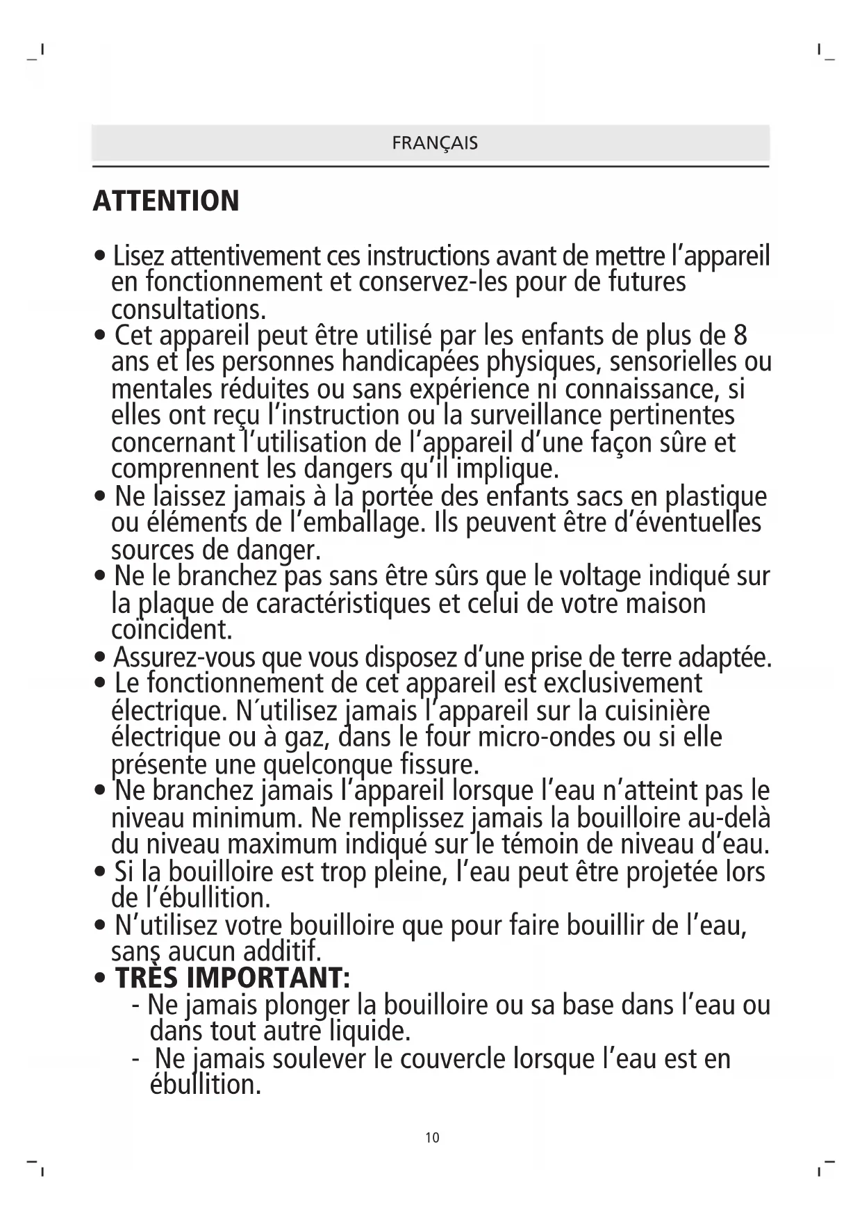 - N’utilisez votre bouilloire que pour faire bouillir de l’eau, sans aucun additif.