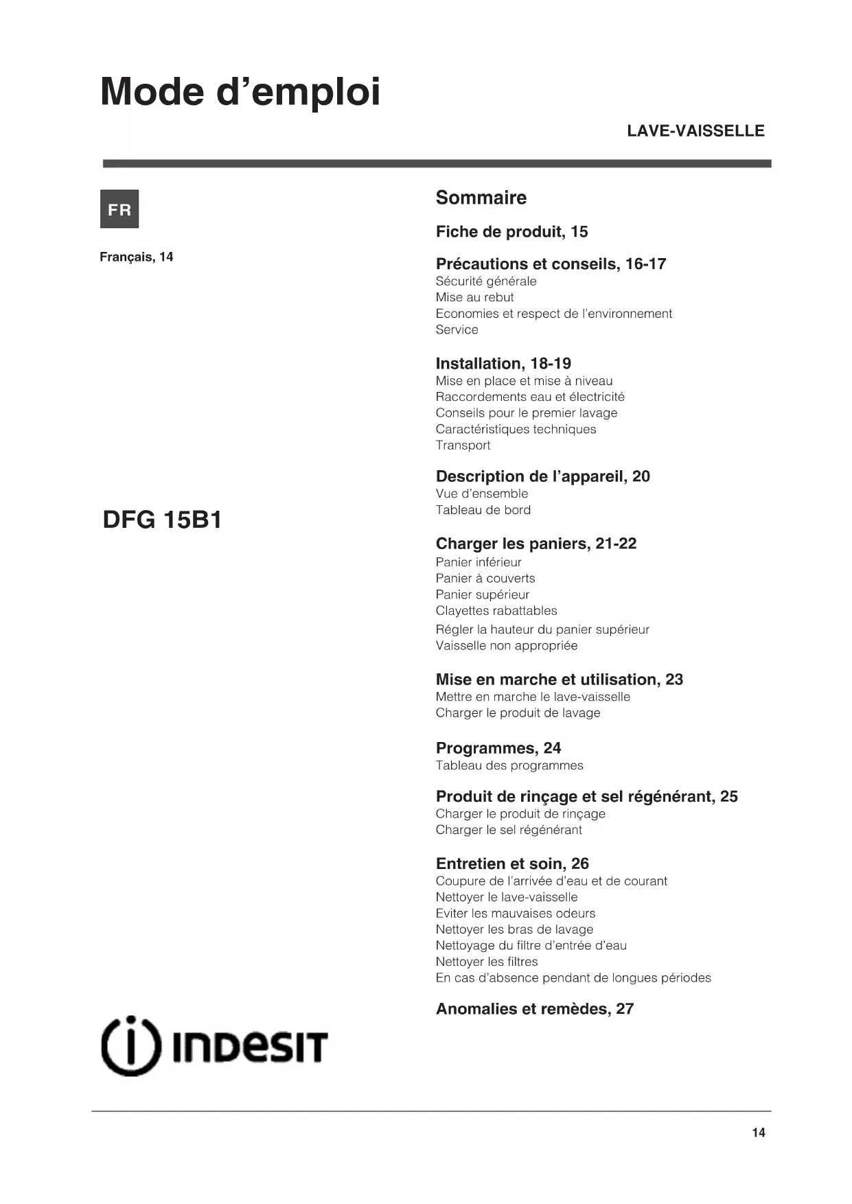 DFG 15B1 A EU - Lave-vaisselle INDESIT - Notice d'utilisation et mode d'emploi gratuit