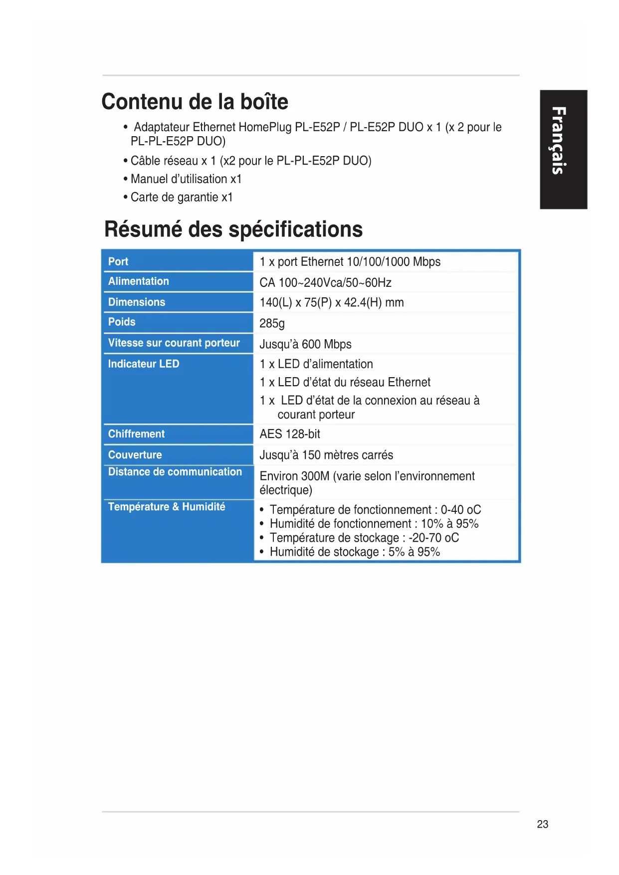 • Adaptateur Ethernet HomePlug PL-E52P / PL-E52P DUO x 1 (x 2 pour le