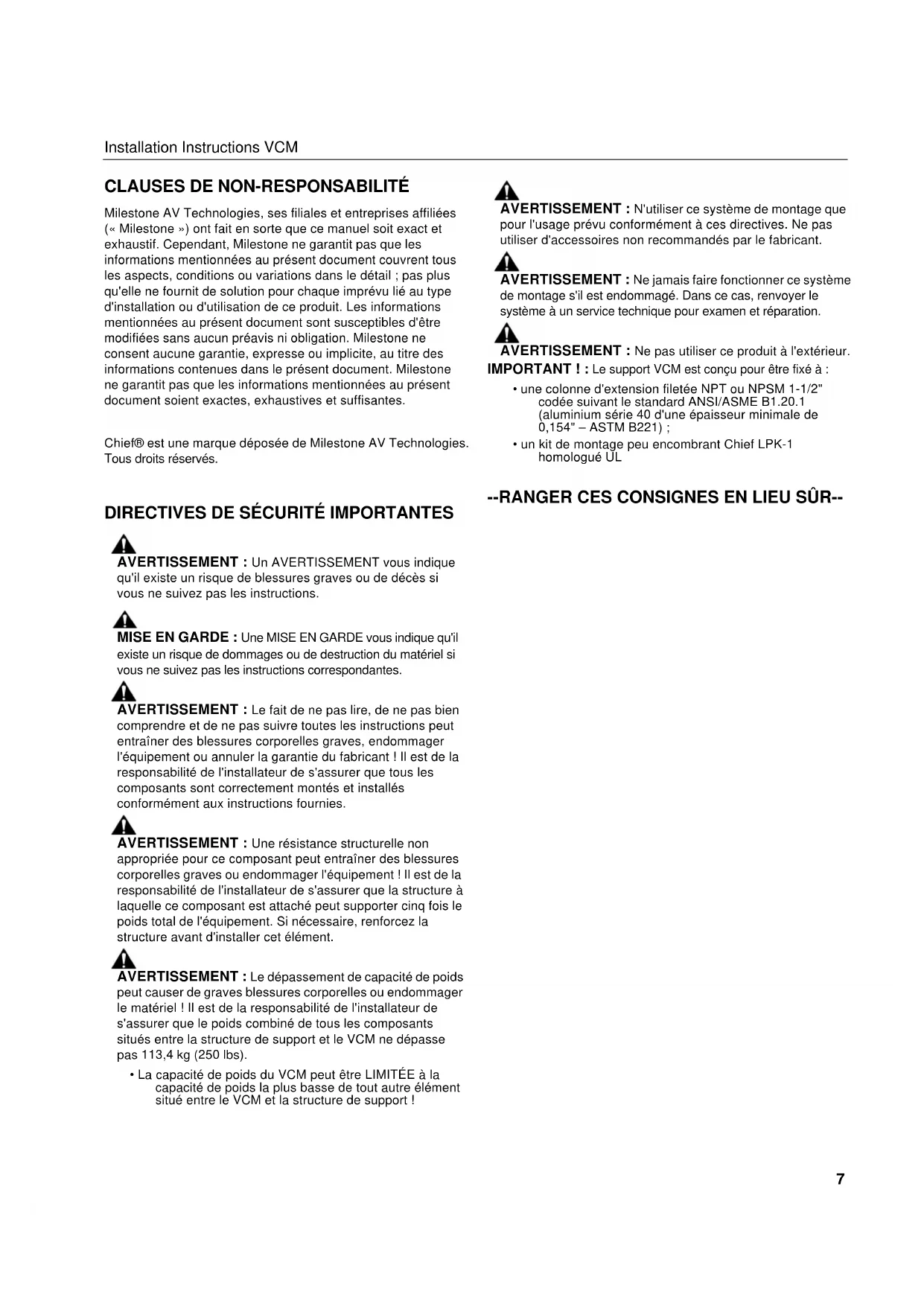 Milestone AV Technologies, ses filiales et entreprises affiliées (« Milestone ») ont fait en sorte que ce manuel soit exact et exhaustif. Cependant, Milestone ne garantit pas que les informations mentionnées au présent document couvrent tous les aspects, conditions ou variations dans le détail ; pas plus qu'elle ne fournit de solution pour chaque imprévu lié au type d'installation ou d'utilisation de ce produit. Les informations mentionnées au présent document sont susceptibles d'être modifiées sans aucun préavis ni obligation. Milestone ne consent aucune garantie, expresse ou implicite, au titre des informations contenues dans le présent document. Milestone ne garantit pas que les informations mentionnées au présent document soient exactes, exhaustives et suffisantes. Chief® est une marque déposée de Milestone AV Technologies. Tous droits réservés.