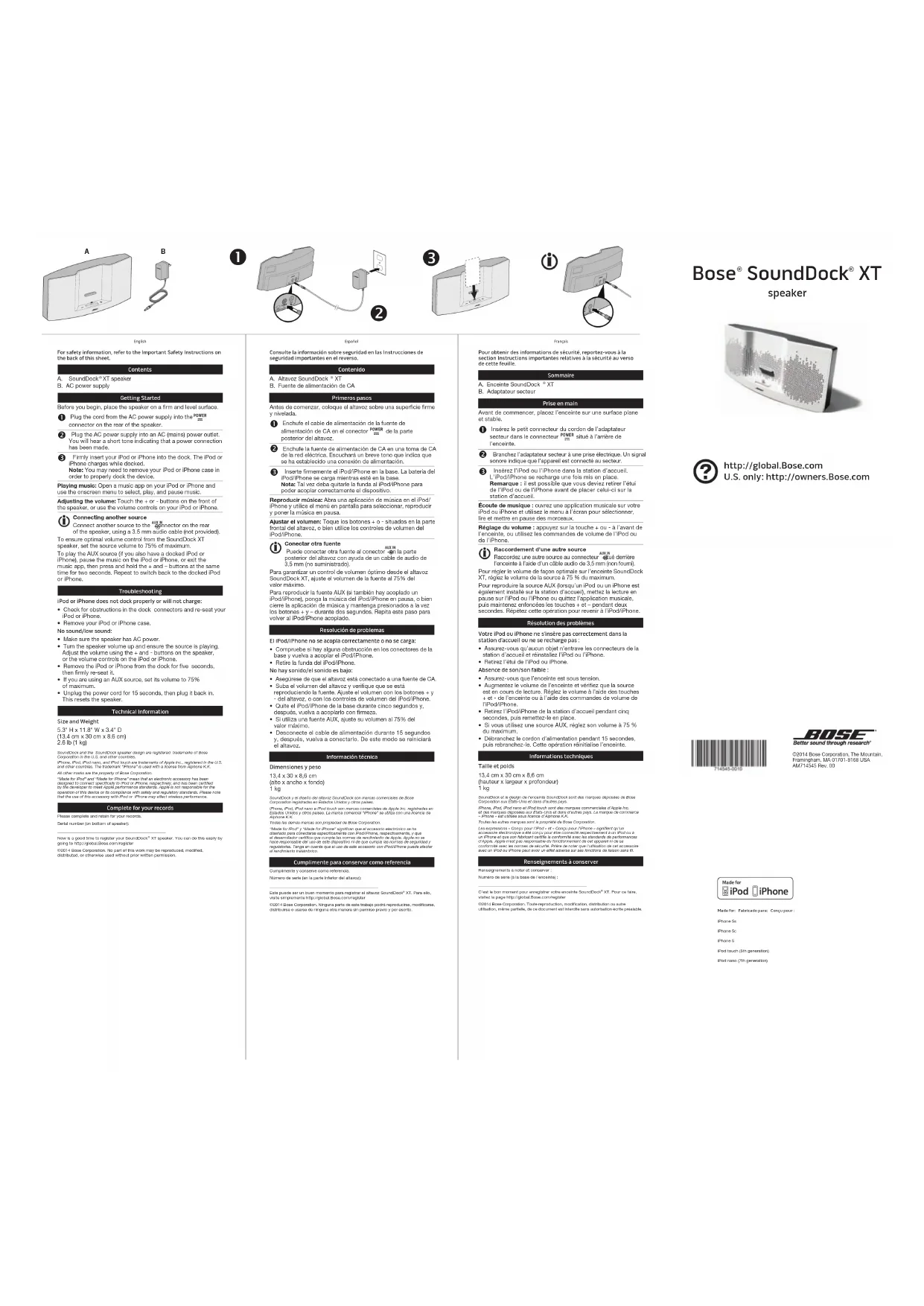 Branchez l’adaptateur secteur à une prise électrique. Un signal sonore indique que l’appareil est connecté au secteur. Insérez l’iPod ou l’iPhone dans la station d’accueil. L’iPod/iPhone se recharge une fois mis en place. Remarque : il est possible que vous deviez retirer l’étui de l’iPod ou de l’iPhone avant de placer celui-ci sur la station d’accueil. Écoute de musique : ouvrez une application musicale sur votre iPod ou iPhone et utilisez le menu à l’écran pour sélectionner, lire et mettre en pause des morceaux.Réglage du volume : appuyez sur la touche + ou - à l’avant de l’enceinte, ou utilisez les commandes de volume de l’iPod ou de l’iPhone. Raccordement d’une autre sourceRaccordez une autre source au connecteur situé derrière l’enceinte à l’aide d’un câble audio de 3,5 mm (non fourni).Pour régler le volume de façon optimale sur l’enceinte SoundDock XT, réglez le volume de la source à 75 % du maximum. Pour reproduire la source AUX (lorsqu’un iPod ou un iPhone est également installé sur la station d’accueil), mettez la lecture en pause sur l’iPod ou l’iPhone ou quittez l’application musicale, puis maintenez enfoncées les touches + et – pendant deux secondes. Répétez cette opération pour revenir à l’iPod/iPhone.Résolution des problèmesVotre iPod ou iPhone ne s’insère pas correctement dans la station d’accueil ou ne se recharge pas:• Assurez-vous qu’aucun objet n’entrave les connecteurs de la station d’accueil et réinstallez l’iPod ou l’iPhone. • Retirez l’étui de l’iPod ou iPhone.Absence de son/son faible:• Assurez-vous que l’enceinte est sous tension.• Augmentez le volume de l’enceinte et vérifiez que la source est en cours de lecture. Réglez le volume à l’aide des touches + et - de l’enceinte ou à l’aide des commandes de volume de l’iPod/iPhone.• Retirez l’iPod/iPhone de la station d’accueil pendant cinq secondes, puis remettez-le en place.• Si vous utilisez une source AUX, réglez son volume à 75 % du maximum.• Débranchez le cordon d’alimentation pendant 15 secondes, puis rebranchez-le. Cette opération réinitialise l’enceinte.Informations techniquesTaille et poids13,4 cm x 30 cm x 8,6 cm (hauteur x largeur x profondeur) 1 kg SoundDock et le design de l’enceinte SoundDock sont des marques déposées de Bose Corporation aux États-Unis et dans d’autres pays.iPhone, iPod, iPod nano et iPod touch sont des marques commerciales d’Apple Inc. et des marques déposées aux États-Unis et dans d’autres pays. La marque de commerce « iPhone » est utilisée sous licence d’Aiphone K.K.Toutes les autres marques sont la propriété de Bose Corporation.Les expressions « Conçu pour l’iPod » et « Conçu pour l’iPhone » signifient qu’un accessoire électronique a été conçu pour être connecté respectivement à un iPod ou à un iPhone et que son fabricant certifie la conformité avec les standards de performances d’Apple. Apple n’est pas responsable du fonctionnement de cet appareil ni de sa conformité avec les normes de sécurité. Prière de noter que l’utilisation de cet accessoire avec un iPod ou iPhone peut avoir un effet adverse sur ses fonctions de liaison sans fil.Renseignements à conserverRenseignements à noter et conserver :Numéro de série (à la base de l’enceinte) :___________________________________________________C’est le bon moment pour enregistrer votre enceinte SoundDock ® XT. Pour ce faire, visitez la page http://global.Bose.com/register©2014 Bose Corporation. Toute reproduction, modification, distribution ou autre utilisation, même partielle, de ce document est interdite sans autorisation écrite préalable.Important Safety Instructions