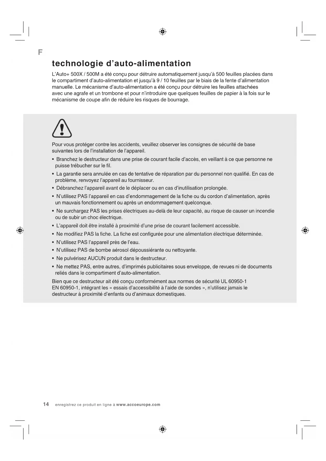 - Veuillez noter que la destruction de feuilles attachées par un trombone ou une agrafe usera progressivement les lames et n’est pas couverte par la garantie. L’Auto+ 500X est destiné à détruire jusqu’à 50 cartes bancaires et 50 CD/DVD au cours de la période de garantie standard de 2 ans. Toute destruction excessive de cartes bancaires ou de CD/DVD annulera la garantie supplémentaire pour les lames. Ces conditions seront à tous égards régies par le droit anglais et interprétées conformément à celui-ci, et soumises à la compétence exclusive des tribunaux anglais.D 22 registrieren sie dieses produkt online bei www.accoeurope.com Zur Vermeidung von Personenschäden müssen die folgenden grundlegenden Sicherheitshinweise beachtet werden: