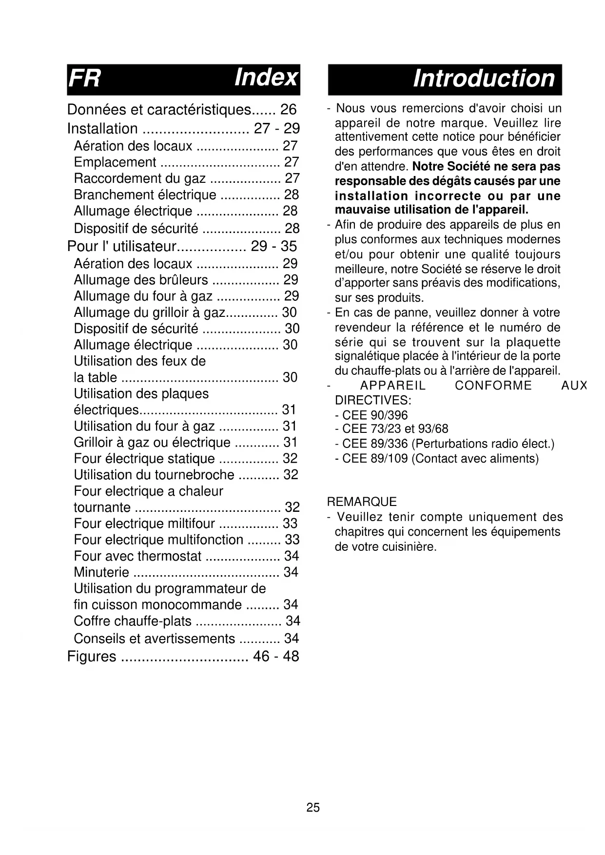Aération des locaux 29 Allumage des brûleurs 29 Allumage du four à gaz 29 Allumage du grilloir à gaz 30 Dispositif de sécurité 30 Allumage électrique 30 Utilisation des feux de la table 30 Utilisation des plaques électriques 31 Utilisation du four à gaz 31 Grilloir à gaz ou électrique 31 Four électrique statique 32 Utilisation du tournebroche 32 Four électrique à chaleur tournante 32 Four électrique multifour 33 Four électrique multifonction 33 Four avec thermostat 34 Minuterie 34 Utilisation du programmateur de fin cuisson monocommande 34 Coffre-chauffe-plats 34 Conseils et avertissements 34