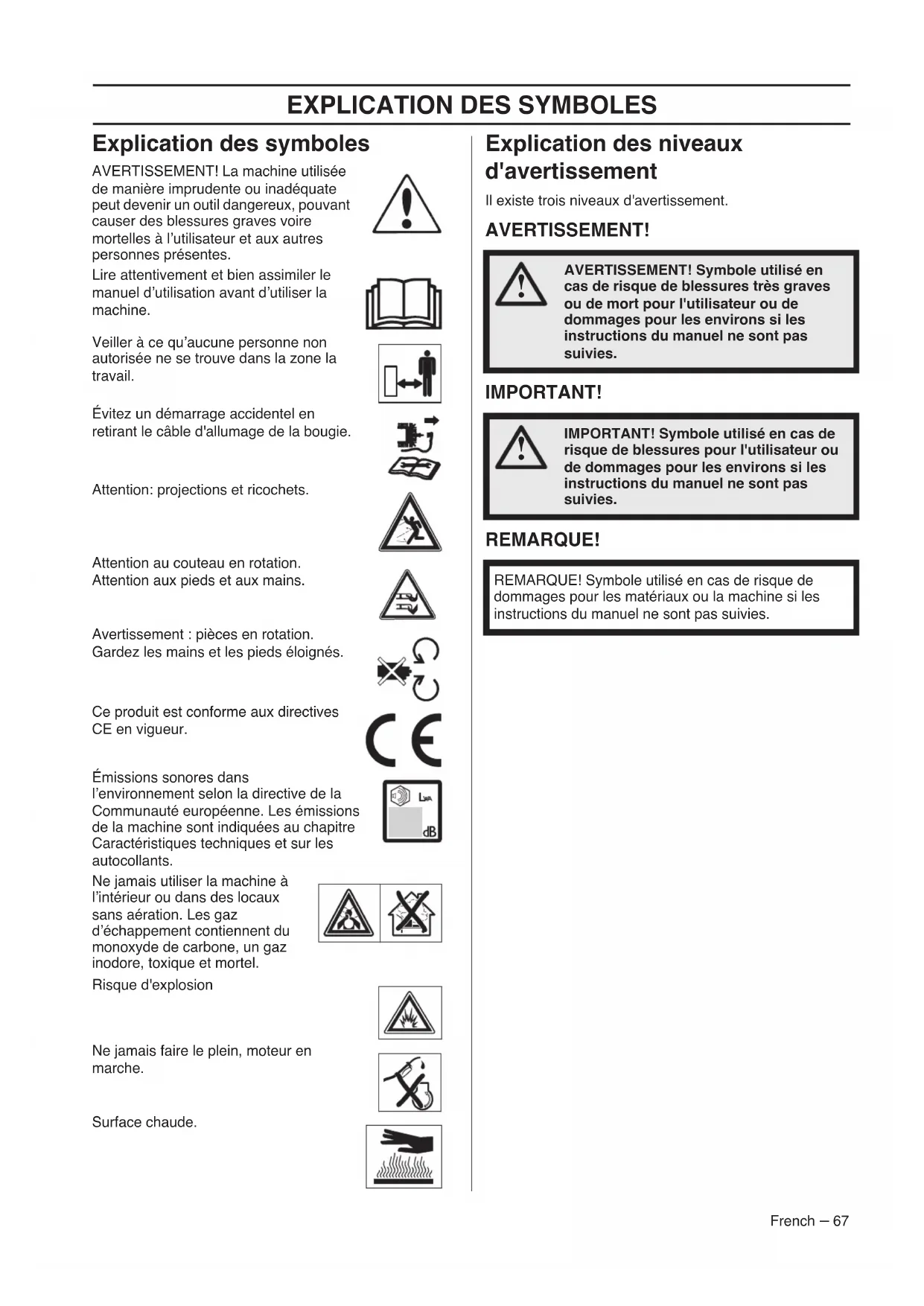 - 2005/88/EC ”amending Directive 2000/14/EC” 14 December 2005 The declared sound values are stated in the technical data sheet of the operator’s manual. The following standards have been applied: ISO5395-1&2:2013; ISO3744, ISO11094; EN1032, EN1033; ISO14982; Conformity Assessment Procedure, Annex VIII. 20 April 2016 John Thompson, Product and Marketing director EUAP. (Authorized representative for Husqvarna AB and responsible for technical documentation.)EXPLICATION DES SYMBOLES French – 67 Explication des symboles AVERTISSEMENT! La machine utilisée de manière imprudente ou inadéquate peut devenir un outil dangereux, pouvant causer des blessures graves voire mortelles à l’utilisateur et aux autres personnes présentes.Lire attentivement et bien assimiler le manuel d’utilisation avant d’utiliser la machine.Veiller à ce qu’aucune personne non autorisée ne se trouve dans la zone la travail.Évitez un démarrage accidentel en retirant le câble d'allumage de la bougie.Attention: projections et ricochets. Attention au couteau en rotation. Attention aux pieds et aux mains.Avertissement : pièces en rotation. Gardez les mains et les pieds éloignés.Ce produit est conforme aux directives CE en vigueur.Émissions sonores dans l’environnement selon la directive de la Communauté européenne. Les émissions de la machine sont indiquées au chapitre Caractéristiques techniques et sur les autocollants.Ne jamais utiliser la machine à l’intérieur ou dans des locaux sans aération. Les gaz d’échappement contiennent du monoxyde de carbone, un gaz inodore, toxique et mortel.Risque d'explosionNe jamais faire le plein, moteur en marche.Surface chaude. Explication des niveaux d'avertissement Il existe trois niveaux d'avertissement. AVERTISSEMENT! IMPORTANT! REMARQUE!