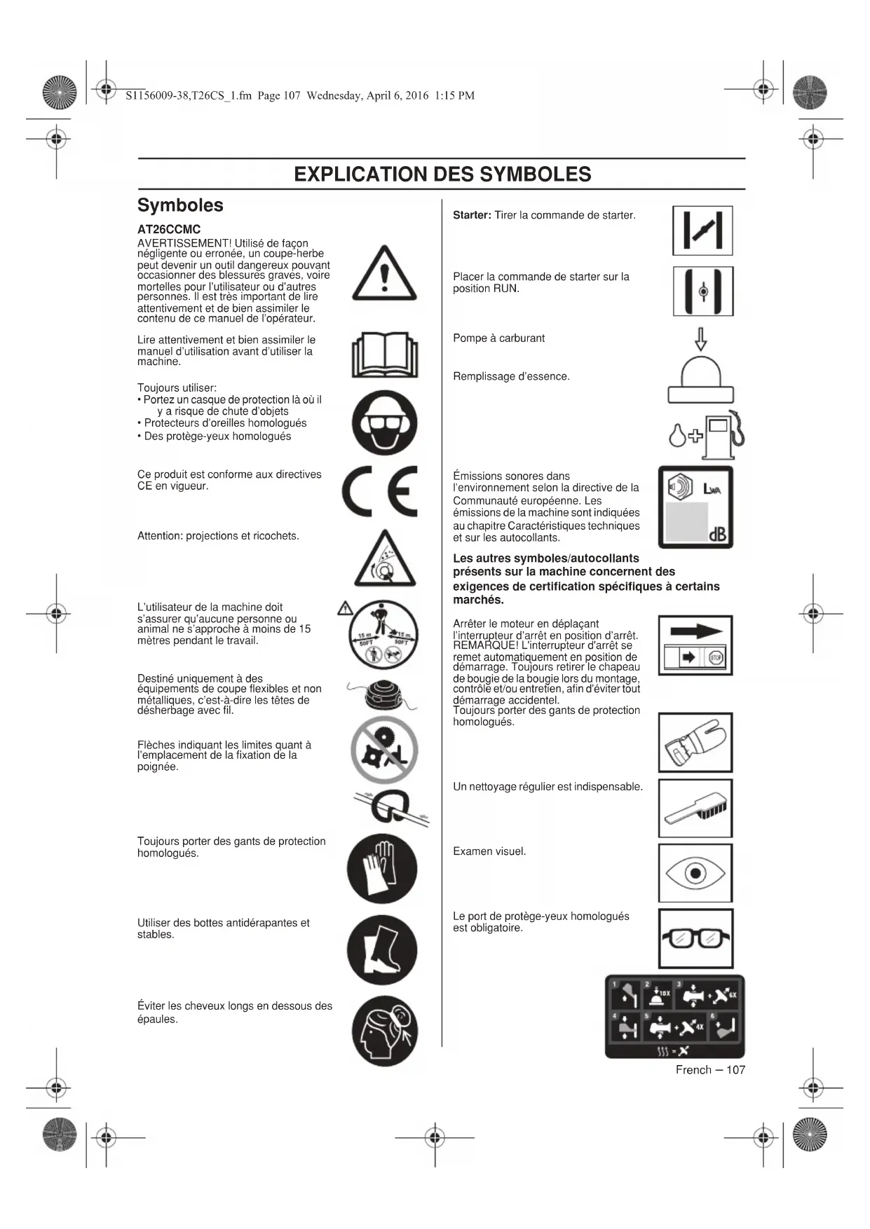 - Des protège-yeux homologués Ce produit est conforme aux directives CE en vigueur. Attention: projections et ricochets. L’utilisateur de la machine doit s’assurer qu’aucune personne ou animal ne s’approche à moins de 15 mètres pendant le travail. Destiné uniquement à des équipements de coupe flexibles et non métalliques, c’est-à-dire les têtes de désherbage avec fil. Flèches indiquant les limites quant à l’emplacement de la fixation de la poignée. Toujours porter des gants de protection homologués. Utiliser des bottes antidérapantes et stables. Éviter les cheveux longs en dessous des épaules. Starter: Tirer la commande de starter. Placer la commande de starter sur la position RUN. Pompe à carburant Remplissage d’essence. Émissions sonores dans l’environnement selon la directive de la Communauté européenne. Les émissions de la machine sont indiquées au chapitre Caractéristiques techniques et sur les autocollants. Les autres symboles/autocollants présents sur la machine concernent des exigences de certification spécifiques à certains marchés. Arrêter le moteur en déplaçant l’interrupteur d’arrêt en position d’arrêt. REMARQUE! L'interrupteur d'arrêt se remet automatiquement en position de démarrage. Toujours retirer le chapeau de bougie de la bougie lors du montage, contrôle et/ou entretien, afin d'éviter tout démarrage accidentel. Toujours porter des gants de protection homologués. Un nettoyage régulier est indispensable. Examen visuel. Le port de protège-yeux homologués est obligatoire. S1156009-38,T26CS_1.fm Page 107 Wednesday, April 6, 2016 1:15 PMSOMMAIRE 108 – French Sommaire Contrôler les points suivants avant la mise en marche: Lire attentivement le manuel d’utilisation.