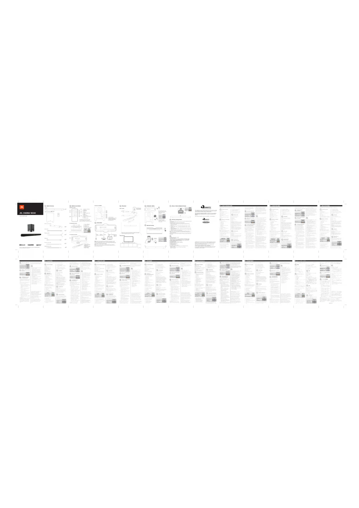 FR Guide de démarrage rapide Contenu de la boîte 1 Remarque : Pour obtenir des informations détaillées sur l'utilisation de votre JBL Cinema SB350, téléchargez le Mode d'emploi complet sur www.jbl.com.Boutons et commandes 2 Branchements 3 Emplacement 4 2a. Télécommande 1) Marche-arrêt / veille 2) Bluetooth 3) HDMI ARC 4) Entrée aux. 5) Optique 6) Marche/arrêt retour audio 7) Silence 8) Volume +/- 9) Volume graves +/-10) Harman Display Surround11) Stéréo12) Volume HarmanNote : Avant d'utiliser la télécommande, retirez la languette en plastique qui protège la pile au bas de la télécommande.2b. Panneau supérieur de la barre de son1) Marche-arrêt / veille2) Sélection de source3) Volume +/-4) Mode d'ambiance Surround5) Source / association Bluetooth Entrée audio optique