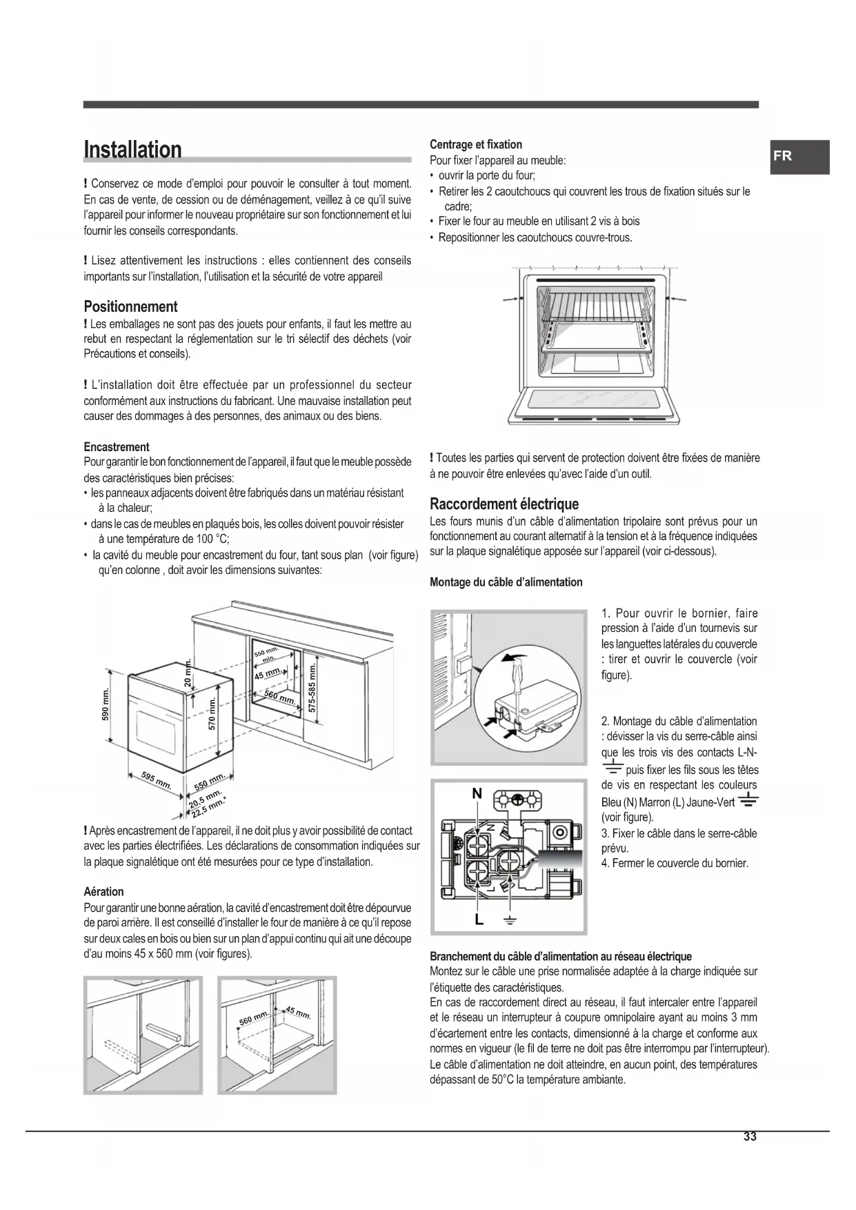 Installation ! Conservez ce mode d’emploi pour pouvoir le consulter à tout moment. En cas de vente, de cession ou de déménagement, veillez à ce qu’il suive l’appareil pour informer le nouveau propriétaire sur son fonctionnement et lui fournir les conseils correspondants. ! Lisez attentivement les instructions : elles contiennent des conseils importants sur l’installation, l’utilisation et la sécurité de votre appareil Positionnement ! Les emballages ne sont pas des jouets pour enfants, il faut les mettre au rebut en respectant la réglementation sur le tri sélectif des déchets (voir Précautions et conseils). ! L’installation doit être effectuée par un professionnel du secteur conformément aux instructions du fabricant. Une mauvaise installation peut causer des dommages à des personnes, des animaux ou des biens. Encastrement Pour garantir le bon fonctionnement de l’appareil, il faut que le meuble possède des caractéristiques bien précises: