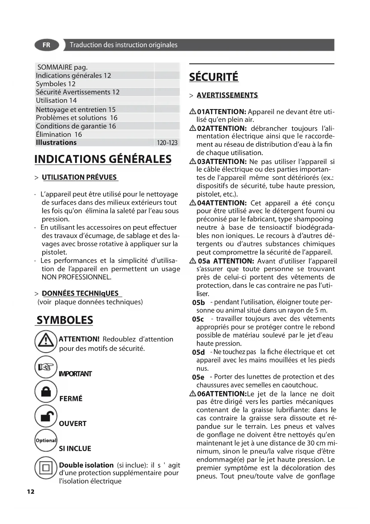 SOMMAIRE pag. Indications générales 12 Symboles 12 Sécurité Avertissements 12 Utilisation 14 Nettoyage et entretien 15 Problèmes et solutions 16 Conditions de garantie 16 Élimination 16 Illustrations 120 -123