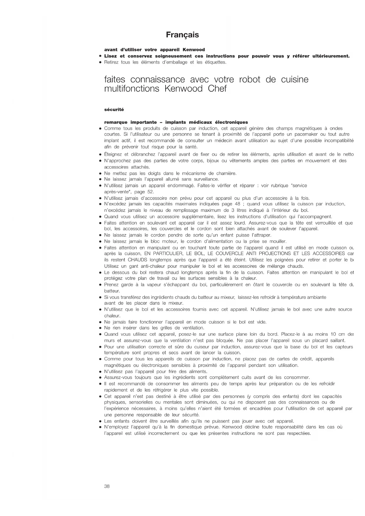 Retirez tous les éléments d’emballage et les étiquettes. faites connaissance avec votre robot de cuisine multifonctions Kenwood Chef sécurité remarque importante – implants médicaux électroniques