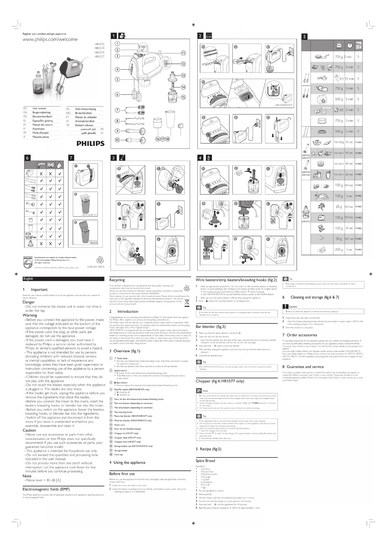 - 1 œuf 1 Placez les ingrédients dans un saladier. 2 Sélectionnez la vitesse 5. 3 Mélangez avec les fouets métalliques / en plastique pendant 1 minute. 4 Maintenez le bol contenant la pâte au chaud pendant 20 minutes. 5 Maintenez le bouton enfoncé pour mélanger les ingrédients pendant 10 secondes. 6 Versez la pâte du pain d’épice dans un moule à gâteau et faites cuire pendant env. 1 heure à 180 °C.Conseil •Cette recette exige beaucoup de votre batteur. Laissez refroidir le batteur jusqu'à ce qu'il atteigne la température de la pièce. 6 Nettoyage et stockage (fig. 6) Attention •Avant de nettoyer l'appareil ou de retirer un accessoire, débranchez-le. 1 Nettoyez le bloc moteur à l’aide d’un chiffon humide. 2 Nettoyez les fouets, les crochets à pétrir, le mixeur plongeant et le bol à l’eau chaude (<60 °C) savonneuse ou au lave-vaisselle. 3 Rangez l’appareil dans un endroit sec. 7 Commande d’accessoires Pour acheter des accessoires pour cet appareil, visitez notre site Web www.philips.com/shop. Si vous rencontrez des problèmes pour vous procurer des accessoires pour votre appareil, contactez le Service Consommateurs Philips de votre pays. Ses coordonnées sont disponibles à l’adresse www.philips.com/support.Vous pouvez commander le mini-hachoir (code n° 3140 039 00211) en tant qu’accessoire supplémentaire des appareils HR1572, HR1574, HR1575 et HR1577 auprès de votre revendeur Philips ou d’un Centre Service Agréé Philips. Suivez les quantités, les temps de préparation et les vitesses du mini-hachoir lorsque vous utilisez cet accessoire. 8 Garantie et service Si vous rencontrez un problème ou souhaitez obtenir des informations supplémentaires, visitez le site Web Philips à l’adresse www.philips.com/support ou contactez le Service Consommateurs Philips de votre pays. Vous trouverez le numéro de téléphone dans le dépliant de garantie internationale. S’il n’existe pas de Service Consommateurs Philips dans votre pays, renseignez-vous auprès de votre revendeur Philips.Italiano 1 Importante Leggere attentamente il presente manuale prima di utilizzare l’apparecchio e conservarlo per riferimenti futuri. Pericolo