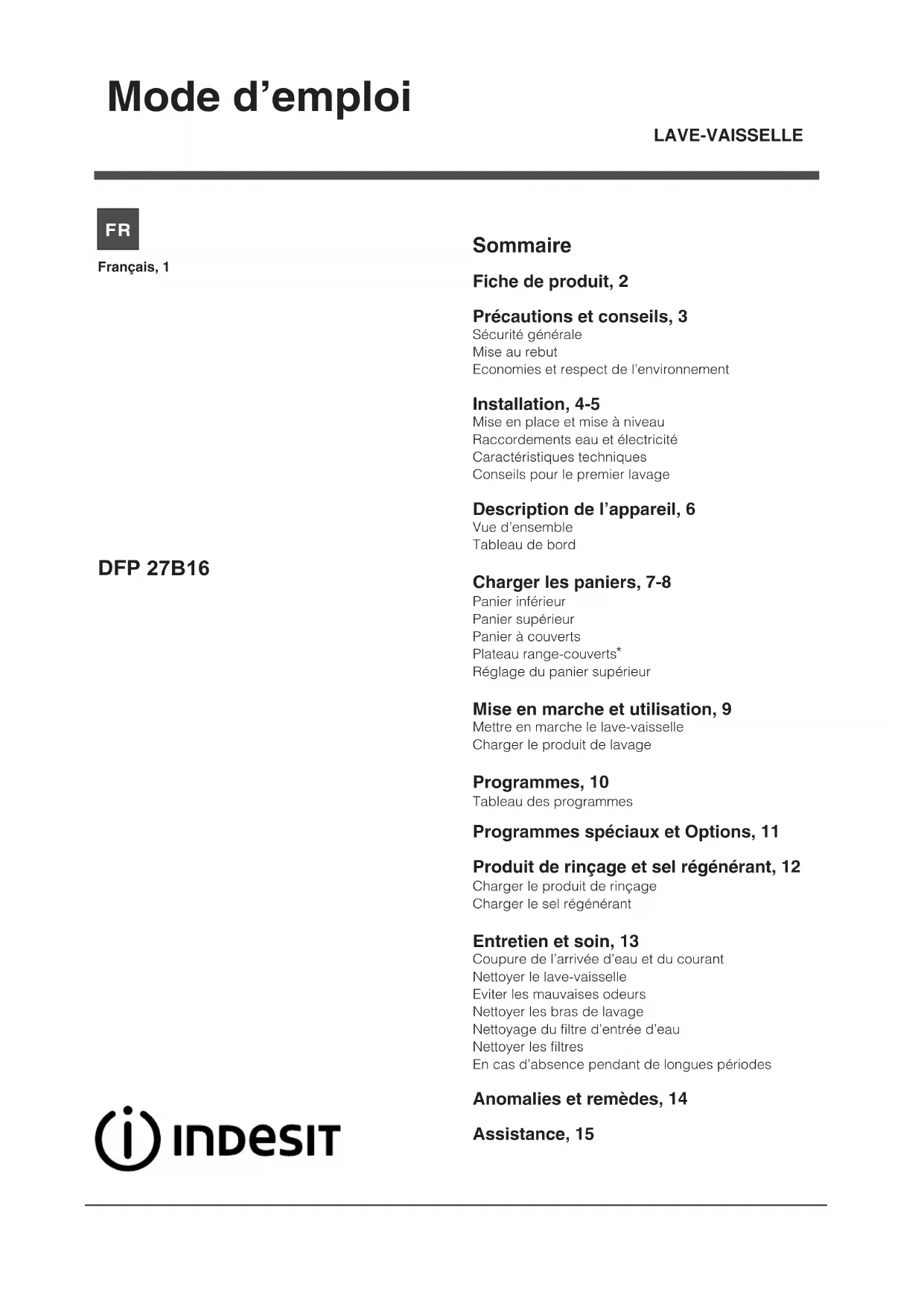 DFP 27B16 NX FR - Lave-vaisselle INDESIT - Notice d'utilisation et mode d'emploi gratuit