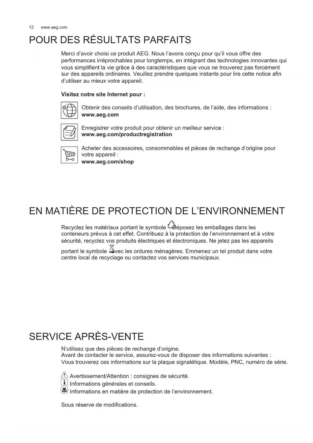 POUR DES RÉSULTATS PARFAITS Merci d’avoir choisi ce produit AEG. Nous l’avons conçu pour qu’il vous offre des