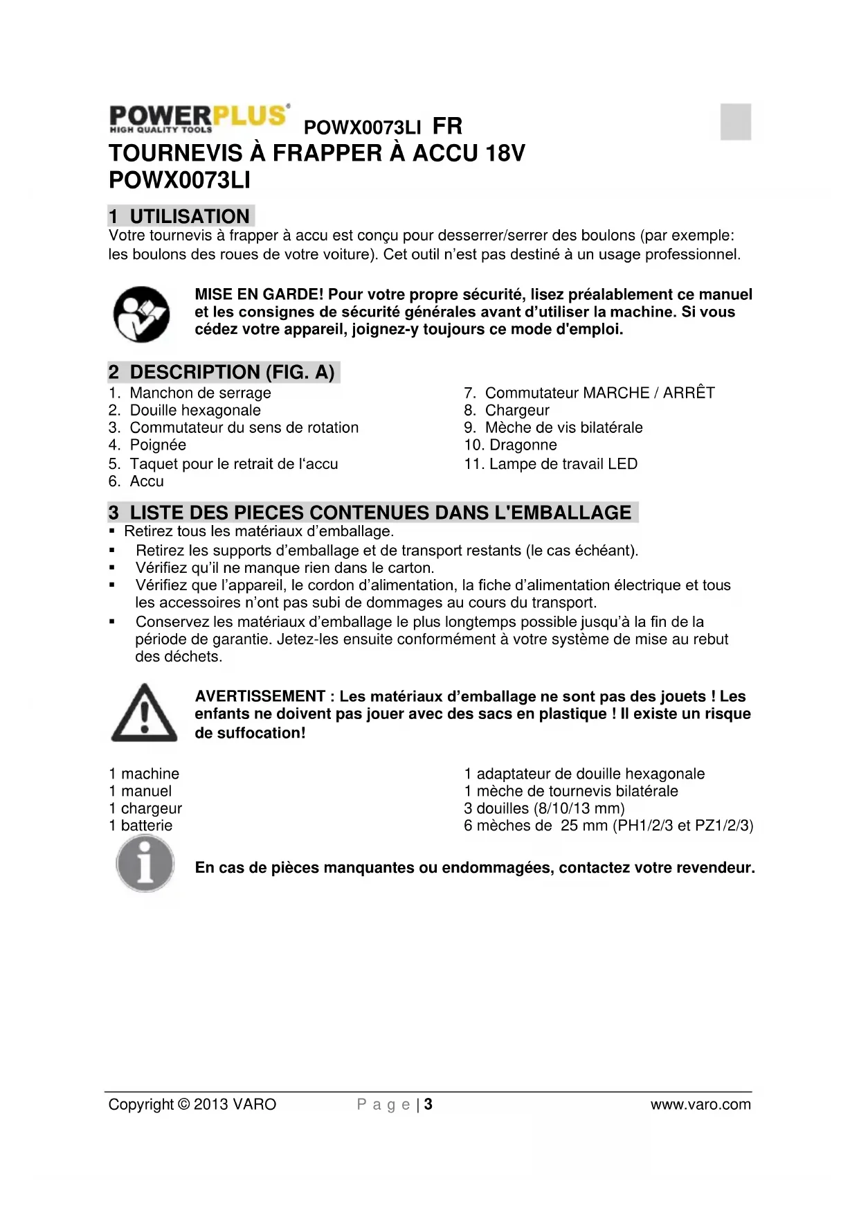 enfants ne doivent pas jouer avec des sacs en plastique ! Il existe un risque de suffocation! 1 machine 1 manuel 1 chargeur 1 batterie 1 adaptateur de douille hexagonale 1 mèche de tournevis bilatérale 3 douilles (8/10/13 mm) 6 mèches de 25 mm (PH1/2/3 et PZ1/2/3) En cas de pièces manquantes ou endommagées, contactez votre revendeur.POWX0073LI FR Copyright © 2013 VARO P a g e | 4 www.varo.com 4 PICTOGRAMMES Les symboles suivants sont utilisés dans ce mode d’emploi et/ou sur la machine: