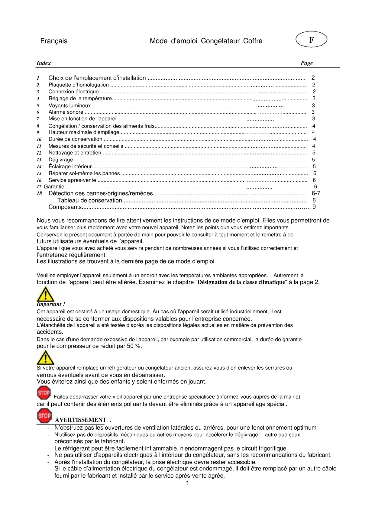 1 Choix de l'emplacement d'installation 2 2 Plaque d'homologation 2 3 Connexionelectrique 2 4 Réglage de la température 3 5 Voyants lumineux 3 6 Alarme sonore 3 7 Mise en fonction de I'appareil 3 8 Congélation / conservation des alimentés frais 4 9 Hauteur maximale d'empilage 4 10Durée de conservation 4 11 Mesures de sécurité et conseils 4 12 Nettoyage et entretien 5 13 Dégivrage 5 14 Eclairage interieur. 5 15 Reparer soi-meme les pannes 6 16 Service après-vente 6 17 Garantie 6 18 Detection des pannes/origines/remèdes 6-7 Tableau de conservation 8 Composants 9