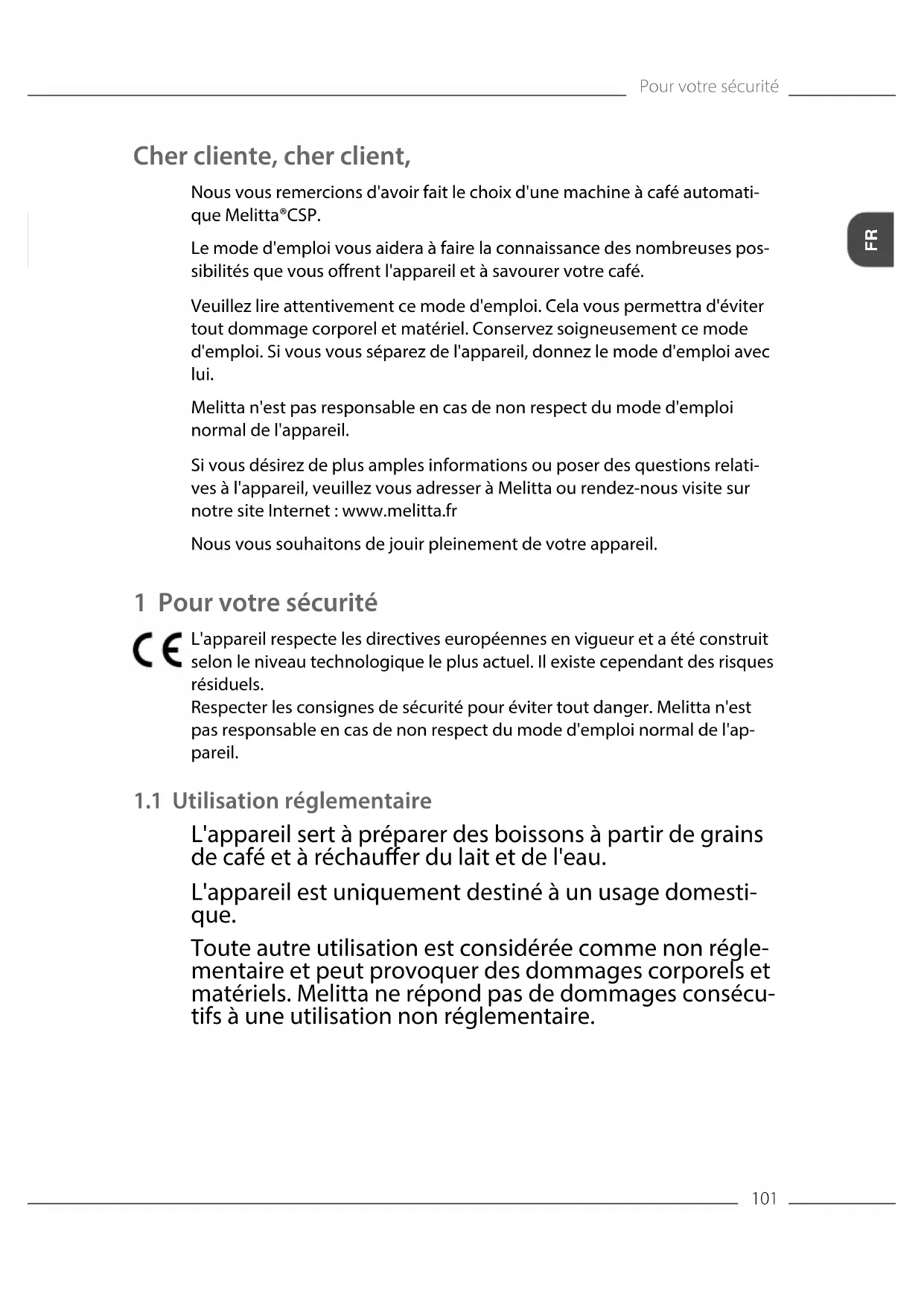 Cher cliente, cher client, Nous vous remercions d'avoir fait le choix d'une machine à café automati- que Melitta®CSP. Le mode d'emploi vous aidera à faire la connaissance des nombreuses pos- sibilités que vous orent l'appareil et à savourer votre café. Veuillez lire attentivement ce mode d'emploi. Cela vous permettra d'éviter tout dommage corporel et matériel. Conservez soigneusement ce mode d'emploi. Si vous vous séparez de l'appareil, donnez le mode d'emploi avec lui. Melitta n'est pas responsable en cas de non respect du mode d'emploi normal de l'appareil. Si vous désirez de plus amples informations ou poser des questions relati- ves à l'appareil, veuillez vous adresser à Melitta ou rendez-nous visite sur notre site Internet: www.melitta.fr Nous vous souhaitons de jouir pleinement de votre appareil. 1 Pour votre sécurité L'appareil respecte les directives européennes en vigueur et a été construit selon le niveau technologique le plus actuel. Il existe cependant des risques résiduels. Respecter les consignes de sécurité pour éviter tout danger. Melitta n'est pas responsable en cas de non respect du mode d'emploi normal de l'ap- pareil.