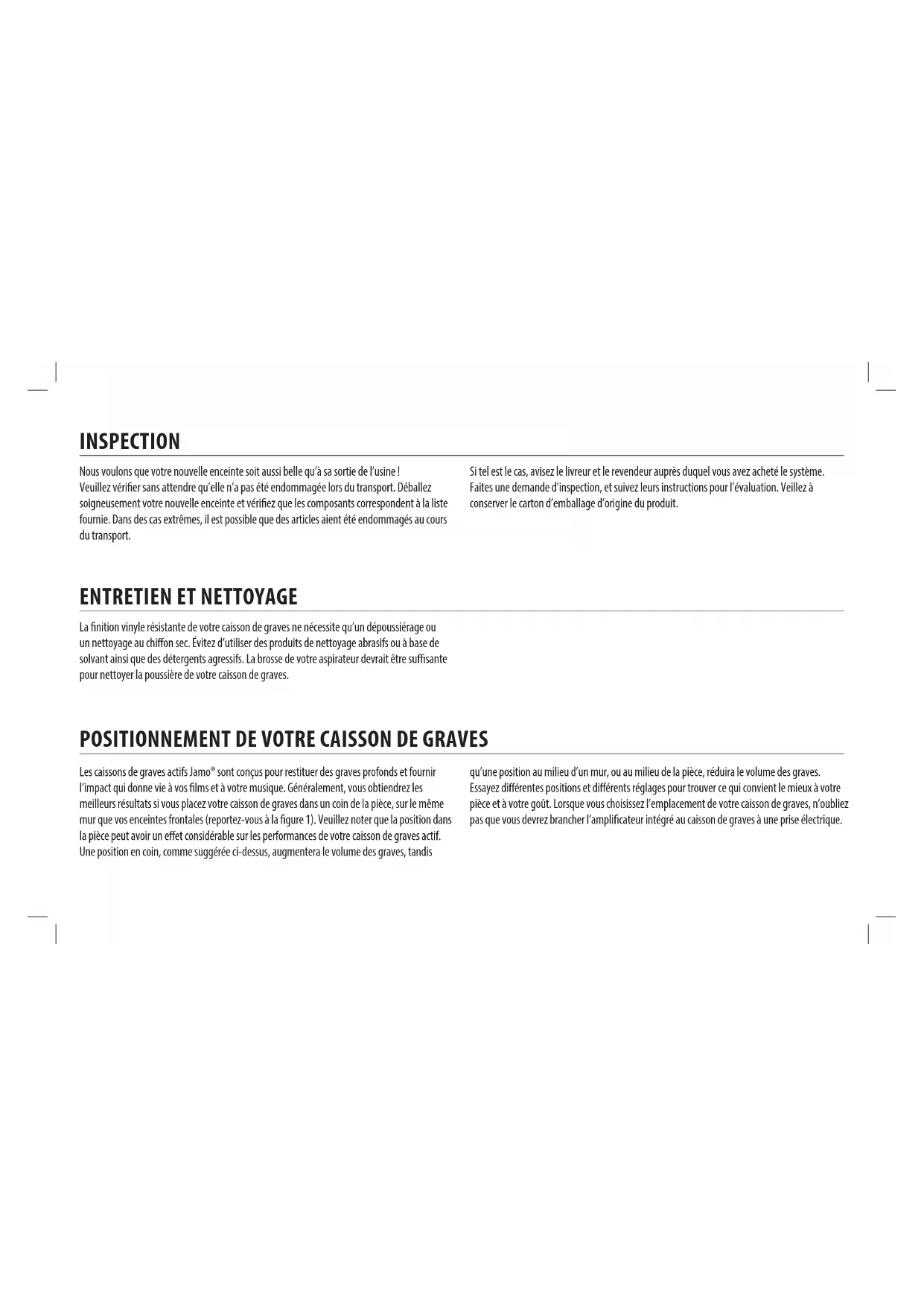 Left and Right pre-outs on Processor/Pre-Amp/Receiver connected to Left and Right line inputs on subwoofer amplier LFE Output on Processor/Pre-Amp/Receiver connected to LFE input on subwoofer amplier Figure 2 Line Level ConnectionsPOSITIONNEMENT DE VOTRE CAISSON DE GRAVES Les caissons de graves actifs Jamo® sont conçus pour restituer des graves profonds et fournir l’impact qui donne vie à vos lms et à votre musique. Généralement, vous obtiendrez les meilleurs résultats si vous placez votre caisson de graves dans un coin de la pièce, sur le même mur que vos enceintes frontales (reportez-vous à la gure 1). Veuillez noter que la position dans la pièce peut avoir un eet considérable sur les performances de votre caisson de graves actif. Une position en coin, comme suggérée ci-dessus, augmentera le volume des graves, tandis qu’une position au milieu d’un mur, ou au milieu de la pièce, réduira le volume des graves. Essayez diérentes positions et diérents réglages pour trouver ce qui convient le mieux à votre pièce et à votre goût. Lorsque vous choisissez l’emplacement de votre caisson de graves, n’oubliez pas que vous devrez brancher l’amplicateur intégré au caisson de graves à une prise électrique. Nous voulons que votre nouvelle enceinte soit aussi belle qu’à sa sortie de l’usine ! Veuillez vérier sans attendre qu’elle n’a pas été endommagée lors du transport. Déballez soigneusement votre nouvelle enceinte et vériez que les composants correspondent à la liste fournie. Dans des cas extrêmes, il est possible que des articles aient été endommagés au cours du transport. Si tel est le cas, avisez le livreur et le revendeur auprès duquel vous avez acheté le système. Faites une demande d’inspection, et suivez leurs instructions pour l’évaluation. Veillez à conserver le carton d’emballage d’origine du produit. INSPECTION La nition vinyle résistante de votre caisson de graves ne nécessite qu’un dépoussiérage ou un nettoyage au chion sec. Évitez d’utiliser des produits de nettoyage abrasifs ou à base de solvant ainsi que des détergents agressifs. La brosse de votre aspirateur devrait être susante pour nettoyer la poussière de votre caisson de graves.