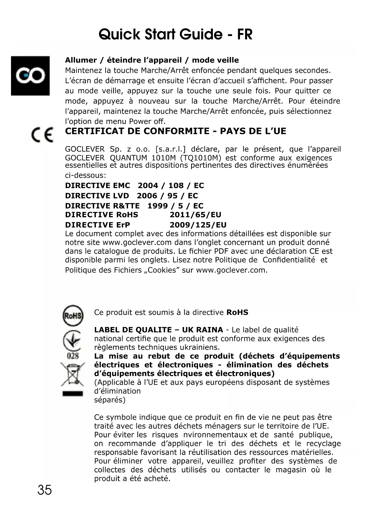 DIRECTIVE RoHS 2011/65/EU DIRECTIVE ErP 2009/125/EU Le document complet avec des informations détaillées est disponible sur notre site www.goclever.com dans l’onglet concernant un produit donné dans le catalogue de produits. Le chier PDF avec une déclaration CE est disponible parmi les onglets. Lisez notre Politique de Condentialité et Politique des Fichiers „Cookies” sur www.goclever.com. Ce produit est soumis à la directive RoHS LABEL DE QUALITE – UK RAINA - Le label de qualité national certie que le produit est conforme aux exigences des règlements techniques ukrainiens. La mise au rebut de ce produit (déchets d’équipements électriques et électroniques - élimination des déchets d’équipements électriques et électroniques) (Applicable à l’UE et aux pays européens disposant de systèmes d’élimination séparés) Ce symbole indique que ce produit en n de vie ne peut pas être traité avec les autres déchets ménagers sur le territoire de l’UE. Pour éviter les risques nvironnementaux et de santé publique, on recommande d’appliquer le tri des déchets et le recyclage responsable favorisant la réutilisation des ressources matérielles. Pour éliminer votre appareil, veuillez proter des systèmes de collectes des déchets utilisés ou contacter le magasin où le produit a été acheté. 35Elimination des batteries usagées (Applicable à l’Union Européenne et aux pays européens disposant de systèmes d’élimination séparés) Ce symbole peut apparaître sur la batterie ou sur l’emballage et indique que la batterie fournie avec ce produit ne doit pas être traitée comme un déchet ménager. Pour certains types de batteries ce symbole peut être utilisé avec un symbole chimique (élément) de mercure (Hg) ou de plomb (Pb) si la batterie contient plus que 0.0005% de mercure ou 0.004% de plomb. L’élimination approprié de ce type de batterie permet d’éviter les conséquences négatives potentielles sur l’environnement et la santé humaine. Le tri des déchets et le recyclage responsable favori- sant la réutilisation des ressources matérielles sont recommandés. Pour des raisons de sécurité, d’ecacité ou de sécurité des données, certains appareils nécessitent une connexion permanente à la batterie intégrée. Ces batteries ne doivent être remplacées que par un personnel qualié. Veuillez déposer les batteries usagées dans les points de collecte de piles appropriés.