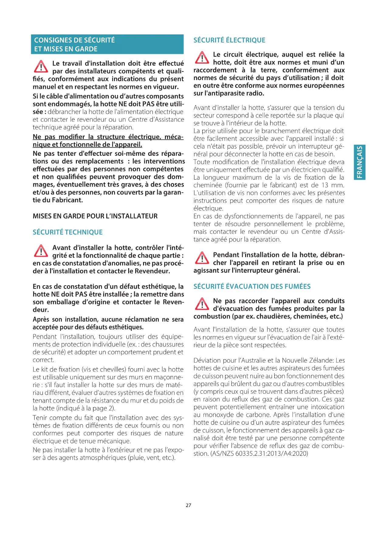 MISES EN GARDE POUR L’INSTALLATEUR SÉCURITÉ TECHNIQUE Avant d'installer la hotte, contrôler l'inté-