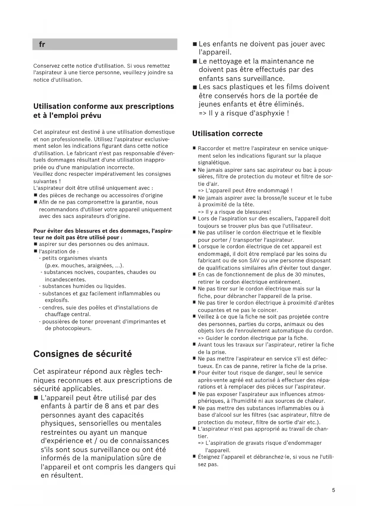 et aspirateur est destiné à une utilisation domestique et non professionnelle. Utilisez l'aspirateur exclusive- ment selon les indications figurant dans cette notice d'utilisation. Le fabricant n'est pas responsable d'éven- tuels dommages résultant d'une utilisation inappro- priée ou d'une manipulation incorrecte. Veuillez donc respecter impérativement les consignes suivantes ! L'aspirateur doit être utilisé uniquement avec : des pièces de rechange ou accessoires d'origine Afin de ne pas compromettre la garantie, nous recommandons d'utiliser votre appareil uniquement avec des sacs aspirateurs d'origine. Pour éviter des blessures et des dommages, l'aspira- teur ne doit pas être utilisé pour : aspirer sur des personnes ou des animaux. l'aspiration de : - petits organismes vivants (p.ex. mouches, araignées, ...). - substances nocives, coupantes, chaudes ou incandescentes. - substances humides ou liquides. - substances et gaz facilement inflammables ou explosifs. - cendres, suie des poêles et d'installations de chauffage central. - poussières de toner provenant d'imprimantes et de photocopieurs. Consignes de sécurité Cet aspirateur répond aux règles tech- niques reconnues et aux prescriptions de sécurité applicables. L'appareil peut être utilisé par des enfants à partir de 8 ans et par des personnes ayant des capacités physiques, sensorielles ou mentales restreintes ou ayant un manque d'expérience et / ou de connaissances s'ils sont sous surveillance ou ont été informés de la manipulation sûre de l'appareil et ont compris les dangers qui en résultent.