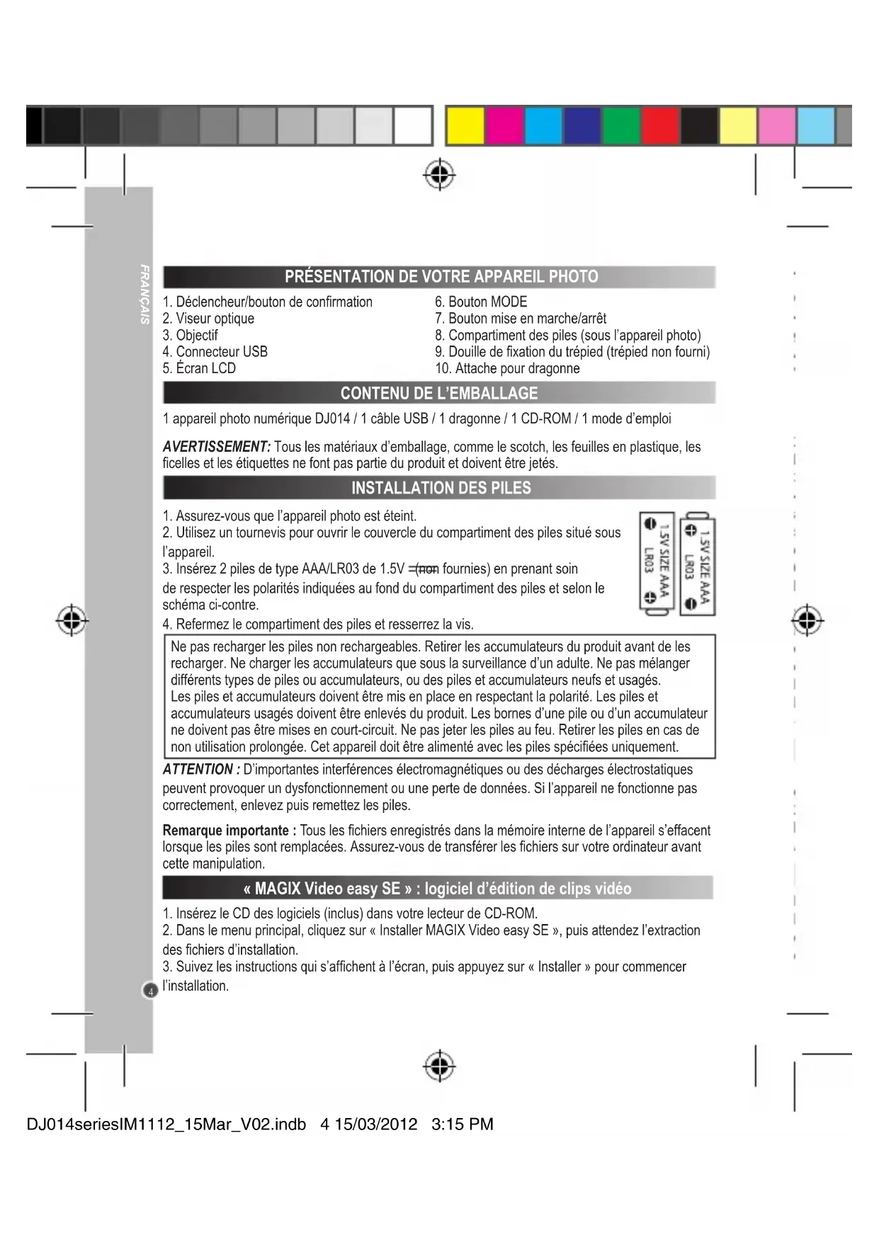 ATTENTION : D’importantes interférences électromagnétiques ou des décharges électrostatiques peuvent provoquer un dysfonctionnement ou une perte de données. Si l’appareil ne fonctionne pas correctement, enlevez puis remettez les piles. Remarque importante : Tous les chiers enregistrés dans la mémoire interne de l’appareil s’effacent lorsque les piles sont remplacées. Assurez-vous de transférer les chiers sur votre ordinateur avant cette manipulation. « MAGIX Video easy SE » : logiciel d’édition de clips vidéo