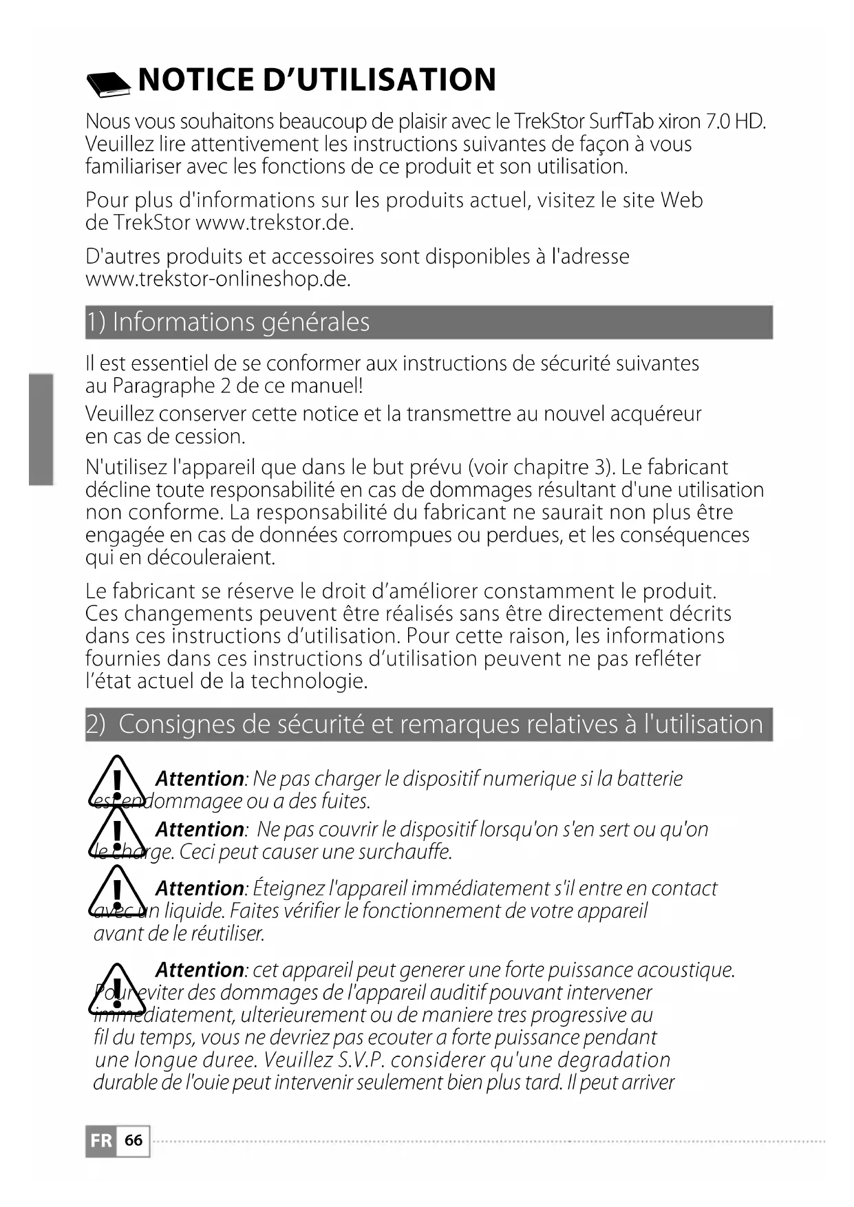Nous vous souhaitons beaucoup de plaisir avec le TrekStor SurfTab xiron 7.0 HD. Veuillez lire attentivement les instructions suivantes de façon à vous familiariser avec les fonctions de ce produit et son utilisation. Pour plus d'informations sur les produits actuel, visitez le site Web de TrekStor www.trekstor.de. D'autres produits et accessoires sont disponibles à l'adresse www.trekstor-onlineshop.de.