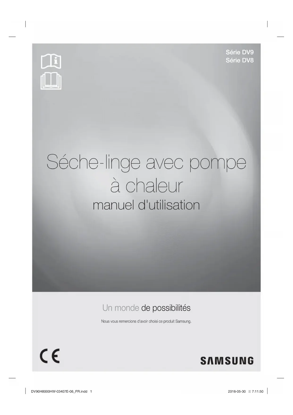 de faire preuve de bon sens, de prudence et de discernement lors de l’installation, de l’entretien et de l’utilisation de votre sèche-linge. Contactez toujours le fabricant en cas de problème ou de situation que vous ne comprenez pas. SYMBOLES ET MESURES DE SÉCURITÉ IMPORTANTS AVERTISSEMENTRisques ou pratiques inadaptées susceptibles de causer de graves blessures ou la mort.ATTENTIONRisques ou pratiques inadaptées susceptibles de causer des blessures moins importantes ou des dommages matériels.ATTENTIONPour réduire le risque d'incendie, d'explosion, d'électrocution ou de blessure lors de l'utilisation de votre sèche-linge, observez les consignes élémentaires de sécurité suivantes:NE PAS faire.NE PAS démonter.NE PAS toucher.Suivez scrupuleusement les consignes.Débrancher la prise murale.S'assurer que l'appareil est relié à la terre afi n d'éviter tout choc électrique.Contacter le service d'assistance technique pour obtenir de l'aide.RemarqueLisez le manuel d’utilisation.Ces icônes d'avertissement ont pour but d'éviter tout risque de blessure corporelle. Respectez-les en toutes circonstances. Lisez attentivement la section Consignes de sécurité de ce manuel et conservez ce dernier en lieu sûr afi n de pouvoir le consulter ultérieurement.Lisez attentivement toutes les consignes avant d'utiliser l'appareil. DV90H8000HW-03407E-06_FR.indd Sec1:4DV90H8000HW-03407E-06_FR.indd Sec1:4 2016-05-30 7:11:572016-05-30 7:11:57Français - 5