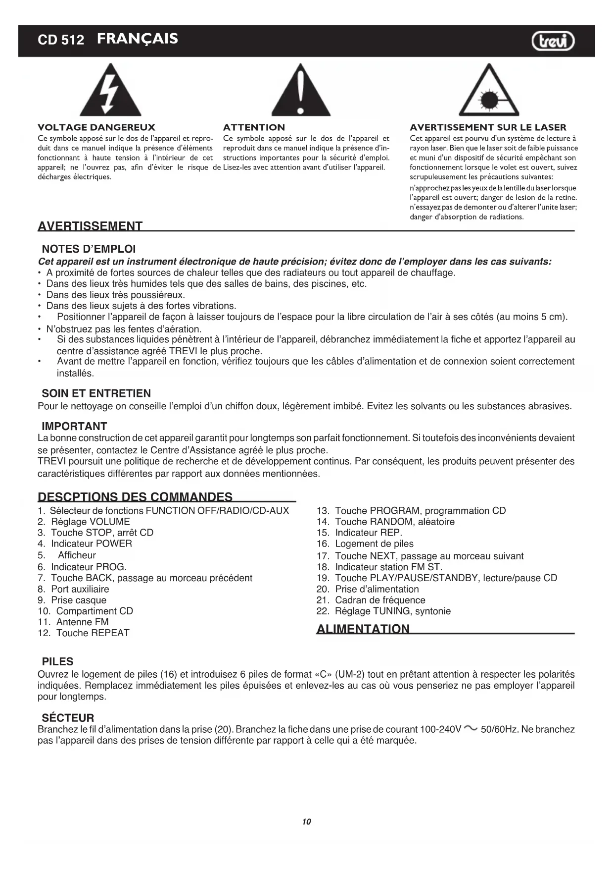 Retrouvez gratuitement la notice de l'appareil CD 512 Trevi au format PDF.