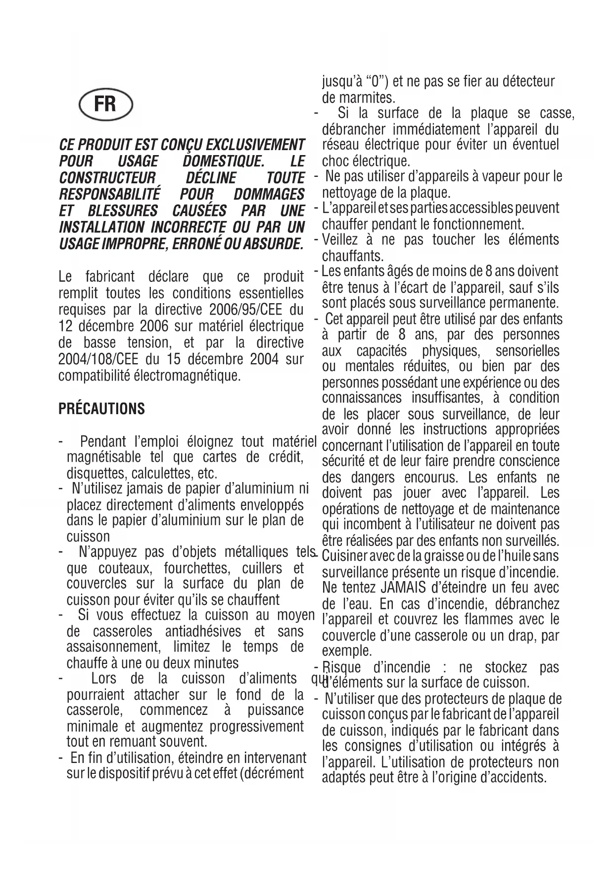 ambiante.THIS APPLIANCE IS CONCEIVED FOR DOMESTIC USE ONLY. THE MANUFACTURER SHALL NOT IN ANY WAY BE HELD RESPONSIBLE FOR WHATEVER INJURIES OR DAMAGES ARE CAUSED BY INCORRECT INSTALLATION OR BY UNSUITABLE, WRONG OR ABSURD USE.