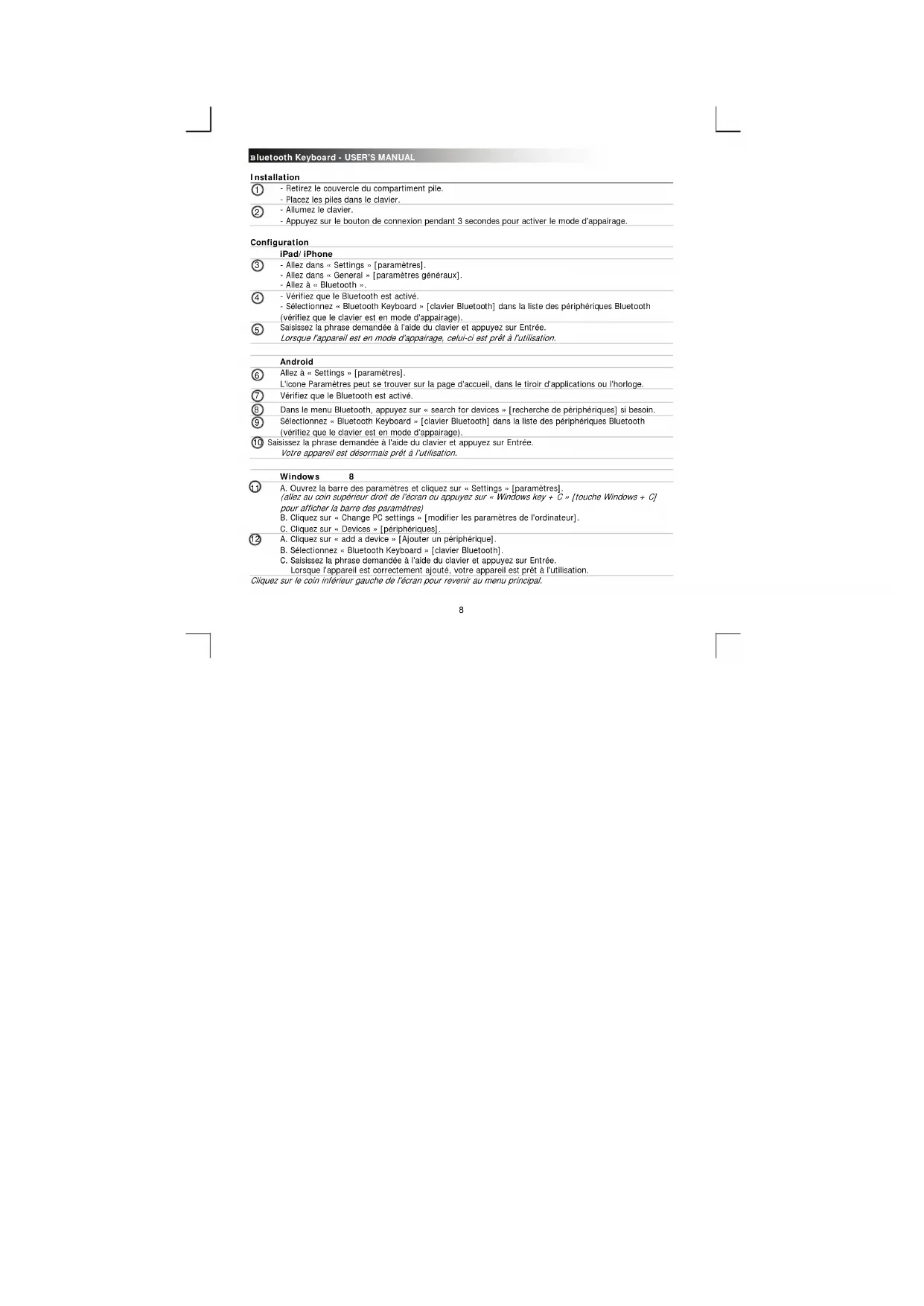 Installation - Retirez le couvercle du compartiment pile. - Placez les piles dans le clavier. - Allumez le clavier. - Appuyez sur le bouton de connexion pendant 3 secondes pour activer le mode d'appairage. Configuration iPad/iPhone - Allez dans « Settings » [paramètres]. - Allez dans « General » [paramètres généraux]. - Allez à « Bluetooth ». - Vérifiez que le Bluetooth est activé. - Sélectionnez « Bluetooth Keyboard » [clavier Bluetooth] dans la liste des périphériques Bluetooth (vérifiez que le clavier est en mode d'appairage). Saisissez la phrase demandée à l'aide du clavier et appuyez sur Entrée. Lorsque l'appareil est en mode d'appairage, celui-ci est prêt à l'utilisation. Android Allez à « Settings » [paramètres]. L'icone Paramètres peut se trouver sur la page d'accueil, dans le tiroir d'applications ou l'horloge. Vérifiez que le Bluetooth est activé. Dans le menu Bluetooth, appuyez sur « search for devices » [recherche de périphériques] si besoin. Sélectionnez « Bluetooth Keyboard » [clavier Bluetooth] dans la liste des périphériques Bluetooth (vérifiez que le clavier est en mode d'appairage). 10 Saisissez la phrase demandée à l'aide du clavier et appuyez sur Entrée. Votre appareil est désormais prêt à l'utilisation. Windows 8 11 A. Ouvrez la barre des paramètres et cliquez sur « Settings » [paramètres]. (allez au coin supérieur droit de l'écran ou appuyez sur « Windows key + C » [touche Windows + C] pour afficher la barre des paramètres) B. Cliquez sur « Change PC settings » [modifier les paramètres de l'ordinateur]. C. Cliquez sur « Devices » [périphériques].