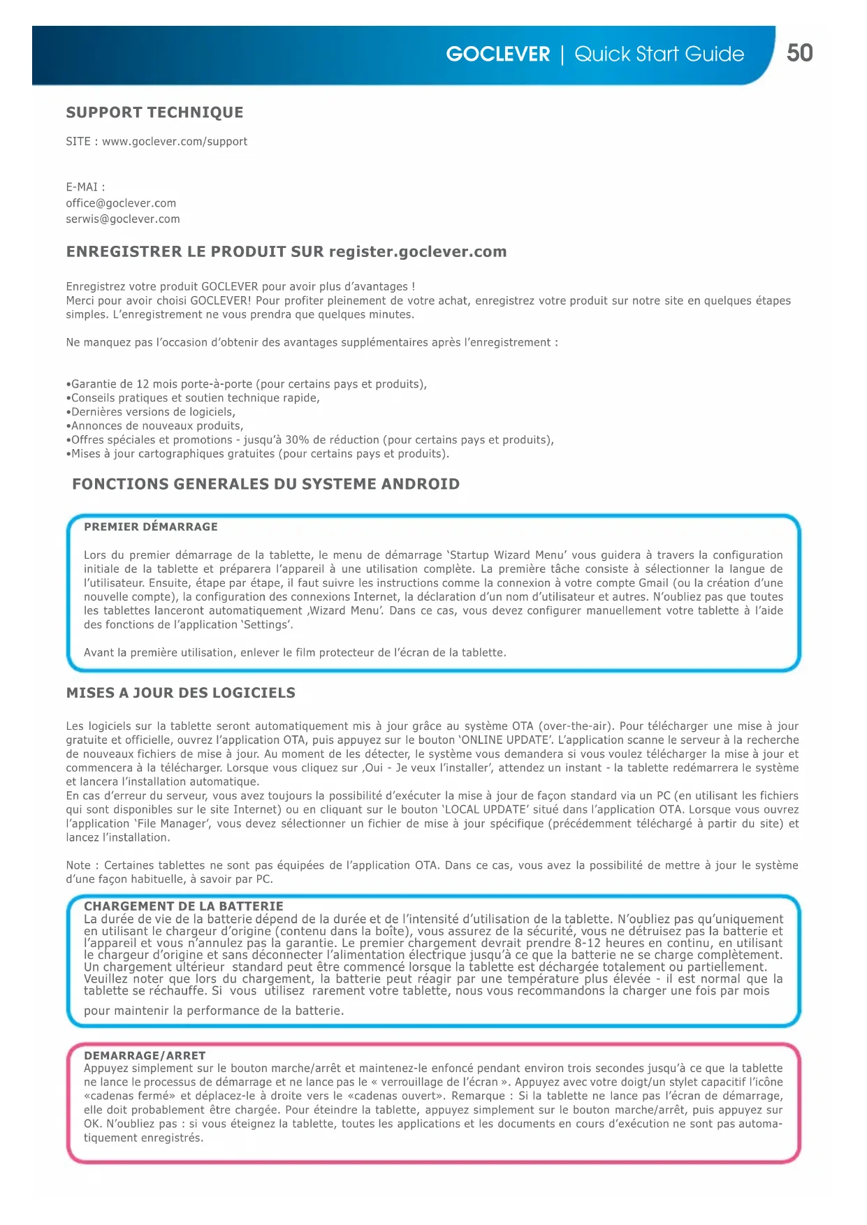 Lors du premier démarrage de la tablette, le menu de démarrage ‘Startup Wizard Menu’ vous guidera à travers la configuration initiale de la tablette et préparera l’appareil à une utilisation complète. La première tâche consiste à sélectionner la langue de l’utilisateur. Ensuite, étape par étape, il faut suivre les instructions comme la connexion à votre compte Gmail (ou la création d’une nouvelle compte), la configuration des connexions Internet, la déclaration d’un nom d’utilisateur et autres. N’oubliez pas que toutes les tablettes lanceront automatiquement ‚Wizard Menu’. Dans ce cas, vous devez configurer manuellement votre tablette à l’aide des fonctions de l’application ‘Settings’. Avant la première utilisation, enlever le film protecteur de l’écran de la tablette. ENREGISTRER LE PRODUIT SUR register.goclever.com Enregistrez votre produit GOCLEVER pour avoir plus d’avantages ! Merci pour avoir choisi GOCLEVER! Pour profiter pleinement de votre achat, enregistrez votre produit sur notre site en quelques étapes simples. L’enregistrement ne vous prendra que quelques minutes. Ne manquez pas l’occasion d’obtenir des avantages supplémentaires après l’enregistrement : •Garantie de 12 mois porte-à-porte (pour certains pays et produits),•Conseils pratiques et soutien technique rapide,•Dernières versions de logiciels,•Annonces de nouveaux produits,•Offres spéciales et promotions - jusqu’à 30% de réduction (pour certains pays et produits),•Mises à jour cartographiques gratuites (pour certains pays et produits).