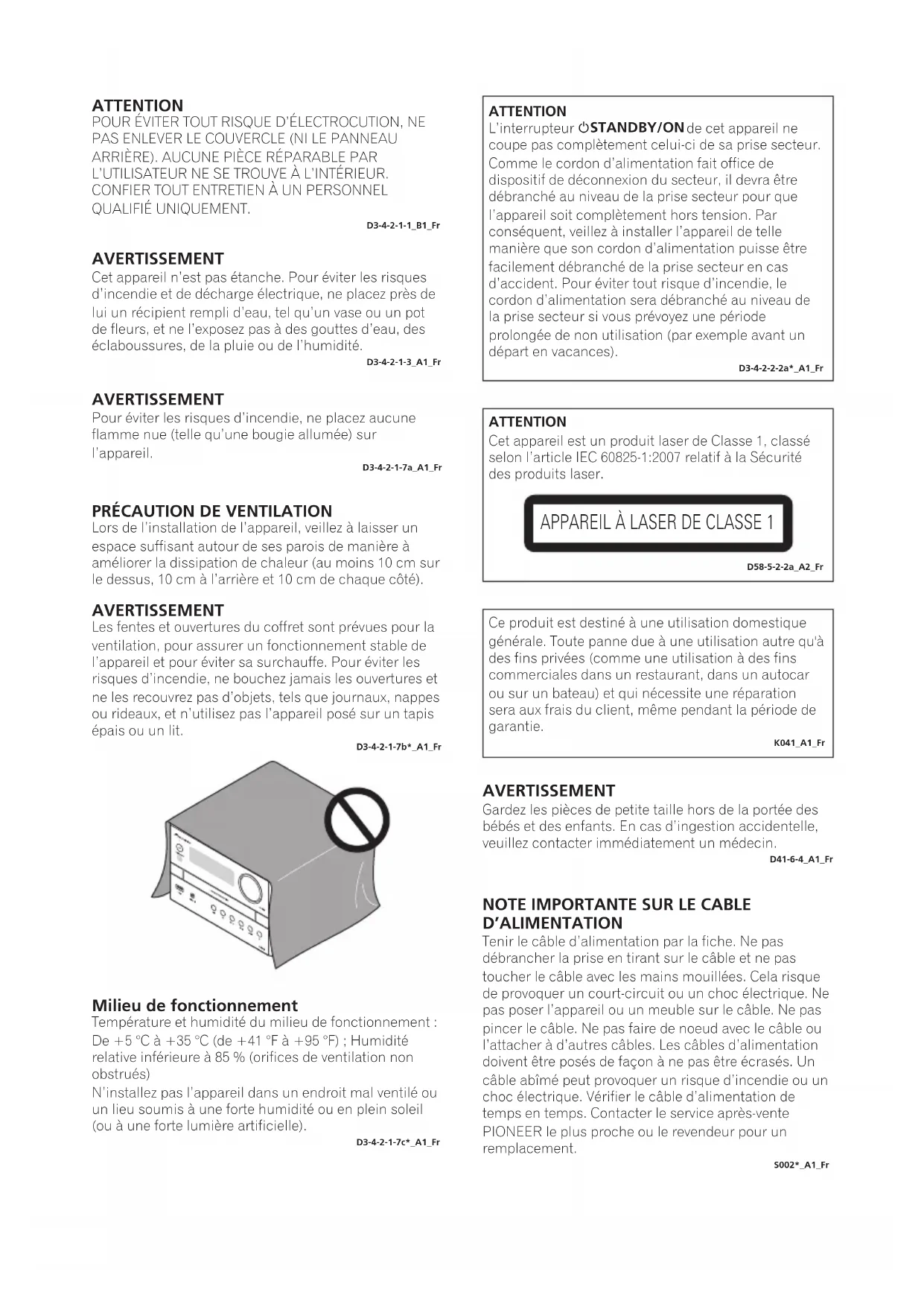 NOTE IMPORTANTE SUR LE CABLE D’ALIMENTATION Tenir le câble d’alimentation par la fiche. Ne pas débrancher la prise en tirant sur le câble et ne pas toucher le câble avec les mains mouillées. Cela risque de provoquer un court-circuit ou un choc électrique. Ne pas poser l’appareil ou un meuble sur le câble. Ne pas pincer le câble. Ne pas faire de noeud avec le câble ou l’attacher à d’autres câbles. Les câbles d’alimentation doivent être posés de façon à ne pas être écrasés. Un câble abîmé peut provoquer un risque d’incendie ou un choc électrique. Vérifier le câble d’alimentation de temps en temps. Contacter le service après-vente PIONEER le plus proche ou le revendeur pour un remplacement.S002*_A1_FrATTENTIONL’interrupteur STANDBY/ON de cet appareil ne coupe pas complètement celui-ci de sa prise secteur. Comme le cordon d’alimentation fait office de dispositif de déconnexion du secteur, il devra être débranché au niveau de la prise secteur pour que l’appareil soit complètement hors tension. Par conséquent, veillez à installer l’appareil de telle manière que son cordon d’alimentation puisse être facilement débranché de la prise secteur en cas d’accident. Pour éviter tout risque d’incendie, le cordon d’alimentation sera débranché au niveau de la prise secteur si vous prévoyez une période prolongée de non utilisation (par exemple avant un départ en vacances).D3-4-2-2-2a*_A1_Fr AVERTISSEMENT Gardez les pièces de petite taille hors de la portée des bébés et des enfants. En cas d’ingestion accidentelle, veuillez contacter immédiatement un médecin. D41-6-4_A1_Fr