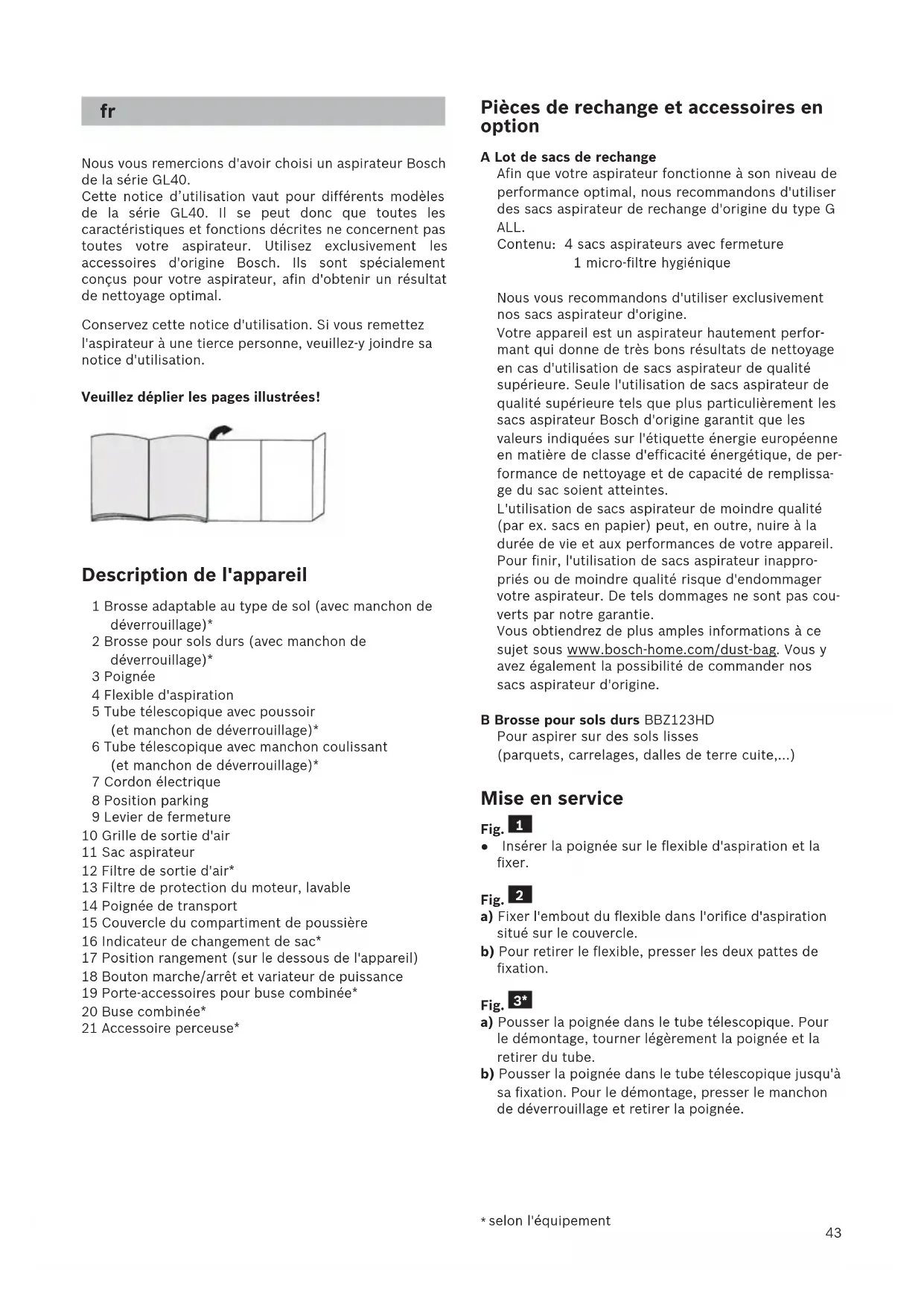 depending on model43 Nous vous remercions d'avoir choisi un aspirateur Bosch de la série GL40. Cette notice d’utilisation vaut pour différents modèles de la série GL40. Il se peut donc que toutes les caractéristiques et fonctions décrites ne concernent pas toutes votre aspirateur. Utilisez exclusivement les accessoires d'origine Bosch. Ils sont spécialement conçus pour votre aspirateur, afin d'obtenir un résultat de nettoyage optimal. Conservez cette notice d'utilisation. Si vous remettez l'aspirateur à une tierce personne, veuillez-y joindre sa notice d'utilisation. Veuillez déplier les pages illustrées! Description de l'appareil 1 Brosse adaptable au type de sol (avec manchon de déverrouillage)* 2 Brosse pour sols durs (avec manchon de déverrouillage)* 3 Poignée 4 Flexible d'aspiration 5 Tube télescopique avec poussoir (et manchon de déverrouillage)* 6 Tube télescopique avec manchon coulissant (et manchon de déverrouillage)* 7 Cordon électrique 8 Position parking 9 Levier de fermeture 10 Grille de sortie d'air 11 Sac aspirateur 12 Filtre de sortie d'air* 13 Filtre de protection du moteur, lavable 14 Poignée de transport 15 Couvercle du compartiment de poussière 16 Indicateur de changement de sac* 17 Position rangement (sur le dessous de l'appareil) 18 Bouton marche/arrêt et variateur de puissance 19 Porte-accessoires pour buse combinée* 20 Buse combinée* 21 Accessoire perceuse* Pièces de rechange et accessoires en option A Lot de sacs de rechange Afin que votre aspirateur fonctionne à son niveau de performance optimal, nous recommandons d'utiliser des sacs aspirateur de rechange d'origine du type G ALL. Contenu: 4 sacs aspirateurs avec fermeture 1 micro-filtre hygiénique Nous vous recommandons d'utiliser exclusivement nos sacs aspirateur d'origine. Votre appareil est un aspirateur hautement perfor- mant qui donne de très bons résultats de nettoyage en cas d'utilisation de sacs aspirateur de qualité supérieure. Seule l'utilisation de sacs aspirateur de qualité supérieure tels que plus particulièrement les sacs aspirateur Bosch d'origine garantit que les valeurs indiquées sur l'étiquette énergie européenne en matière de classe d'efficacité énergétique, de per- formance de nettoyage et de capacité de remplissa- ge du sac soient atteintes. L'utilisation de sacs aspirateur de moindre qualité (par ex. sacs en papier) peut, en outre, nuire à la durée de vie et aux performances de votre appareil. Pour finir, l'utilisation de sacs aspirateur inappro- priés ou de moindre qualité risque d'endommager votre aspirateur. De tels dommages ne sont pas cou- verts par notre garantie. Vous obtiendrez de plus amples informations à ce sujet sous www.bosch-home.com/dust-bag . Vous y avez également la possibilité de commander nos sacs aspirateur d'origine. B Brosse pour sols durs BBZ123HD Pour aspirer sur des sols lisses (parquets, carrelages, dalles de terre cuite,...) Mise en service Fig. Insérer la poignée sur le flexible d'aspiration et la fixer. Fig. a) Fixer l'embout du flexible dans l'orifice d'aspiration situé sur le couvercle. b) Pour retirer le flexible, presser les deux pattes de fixation. Fig. a) Pousser la poignée dans le tube télescopique. Pour le démontage, tourner légèrement la poignée et la retirer du tube. b) Pousser la poignée dans le tube télescopique jusqu'à sa fixation. Pour le démontage, presser le manchon de déverrouillage et retirer la poignée.