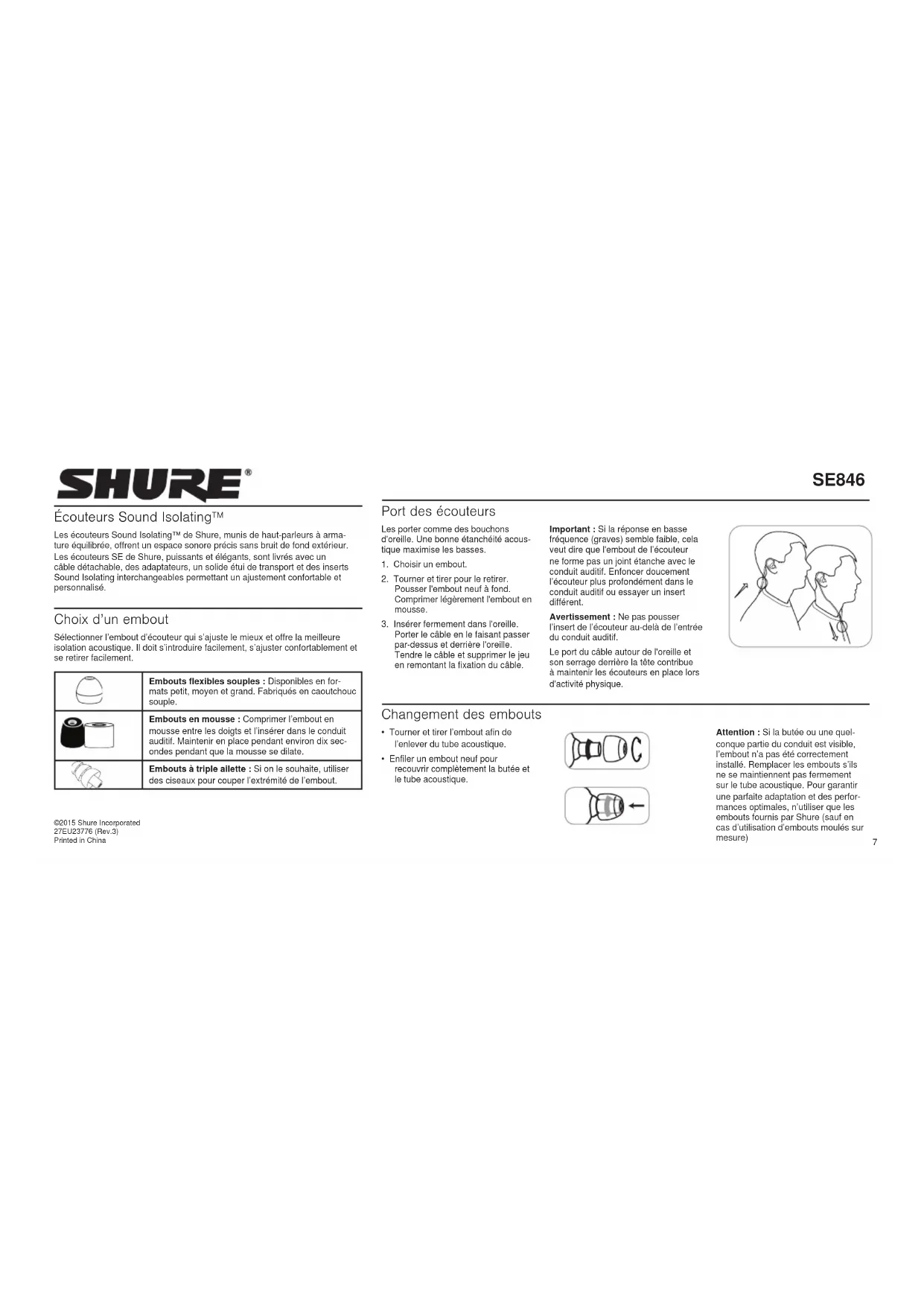 - Nozzle inserts for custom frequency response For optional accessories, visit www.shure.com. Certifications This product meets the Essential Requirements of all relevant European directives and is eligible for CE marking. The CE Declaration of Conformity can be obtained from: www. shure.com/europe/compliance Authorized European representative: Shure Europe GmbH Headquarters Europe, Middle East & Africa Department: EMEA Approval Jakob-Dieffenbacher-Str. 12 75031 Eppingen, Germany Phone: 49-7262-92 49 0 Fax: 49-7262-92 49 11 4 Email: info@shure.de7 SE846 Écouteurs Sound Isolating™ Les écouteurs Sound Isolating™ de Shure, munis de haut-parleurs à arma- ture équilibrée, offrent un espace sonore précis sans bruit de fond extérieur. Les écouteurs SE de Shure, puissants et élégants, sont livrés avec un câble détachable, des adaptateurs, un solide étui de transport et des inserts Sound Isolating interchangeables permettant un ajustement confortable et personnalisé. Choix d’un embout Sélectionner l’embout d’écouteur qui s’ajuste le mieux et offre la meilleure isolation acoustique. Il doit s’introduire facilement, s’ajuster confortablement et se retirer facilement. Embouts flexibles souples : Disponibles en for- mats petit, moyen et grand. Fabriqués en caoutchouc souple. Embouts en mousse : Comprimer l’embout en mousse entre les doigts et l’insérer dans le conduit auditif. Maintenir en place pendant environ dix sec- ondes pendant que la mousse se dilate. Embouts à triple ailette : Si on le souhaite, utiliser des ciseaux pour couper l’extrémité de l’embout. Port des écouteurs Les porter comme des bouchons d'oreille. Une bonne étanchéité acous- tique maximise les basses.
